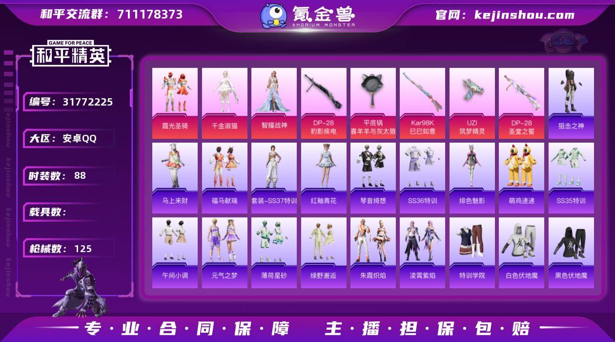 【0载具 5特效枪 4粉装 125枪皮 88套装】女号 套装-霞光圣骑,套装-绿野邂逅,角色-千金淑猫,角色-智耀战神 Kar98K-巳巳如意,UZI-筑梦精灵,DP-28-圣堂之誓,DP-28-豹影疾电,平底锅-喜羊羊与灰太狼 19-1,编号:ZPEXC02
