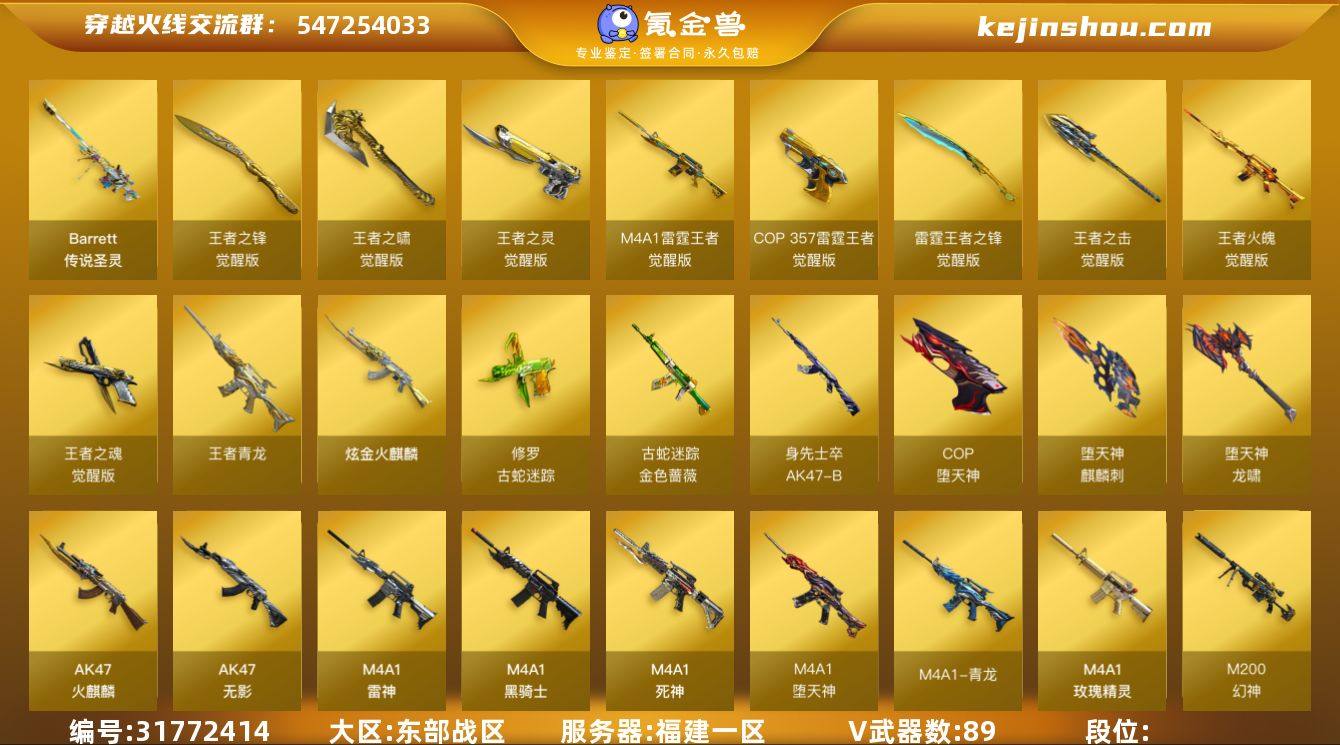 ys【生化爆破号】双传说【传说光耀,传说圣灵】89v【M200-幻神+皮/丹凤,雷霆王者套装,堕天神套装,QBZ03-金色蔷薇,M4A1-青龙,AWM-裁决+皮/羽擎,5盘龙+6烈龙+毒蜂,COP-堕天神,荣耀世冠-柯尔特,COP 357-雷霆王者,黑龙吞噬者,胡萝卜匕首】12王者【M4A1-雷霆王者,王者火魄,王者青龙,COP 357-雷霆王者,王者之魂,王者之灵,雷霆王者之锋,王者之锋,王者之击,王者之啸】3炫金【炫金火麒麟,炫金武士,炫金骑士】6角色【四防电竞教官-云悠悠,零,樱,蛇隐宗,修道士,职业选手,乔伊教练】3音效【AK47-火麒麟音效卡,M4A1-雷神音效卡,M4A1-黑骑士音效卡】50皮【黑骑士-白马银枪,雷神-烈虎,黑骑士-摸金校尉,无影-神兵利器,毁灭-风暴,裁决-羽擎,火麒麟-百城,火麒麟-心动糖果,毁灭-墨兰,毁灭-战神张飞,雷神-星空,雷神-杨戬,火麒麟-雷神,火麒麟-战神关羽,火麒麟-AG战队】 截图展示段位不代表实际段位 如赛季更新等不可抗拒因素发生变化、时限道具不保证所剩时间