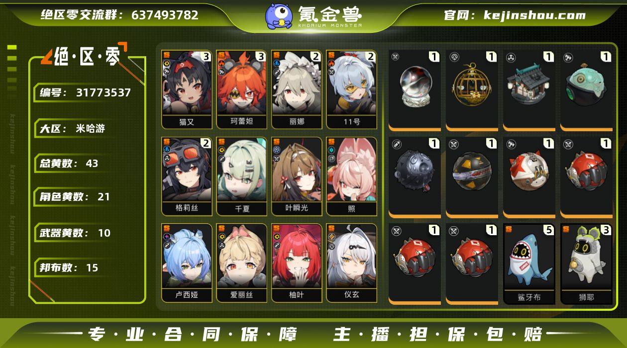 冒险等级:60 总黄数:43 五星角色数:21 菲林底片数量:60 菲林数量:139 加密母带数量:7 3命猫又,3命珂蕾妲,2命丽娜,2命「11号」,2命格莉丝,0命千夏,0命叶瞬光,0命照,0命卢西娅,0命爱丽丝,0命柚叶,0命仪玄,0命薇薇安,0命伊芙琳,0命耀嘉音,0命浅羽悠真,0命星见雅,0命简,0命青衣,0命艾莲,0命莱卡恩 6命潘引壶,6命波可娜,6命赛斯,6命露西,6命苍角,6命派派,6命比利,6命本,6命安比,6命妮可,6命安东,6命可琳,2命真斗 1精云霓孤光,1精青溟笼舍,1精霰落星殿,1精玉壶青冰,1精啜泣摇篮,1精硫磺石,1精燃狱齿轮,1精钢铁肉垫 5精鲨牙布,3精狮耶,3精罗宾,1精芽芽,1精艾丝弥小姐,1精咔嚓仔,1精格列佛探员,1精赤红莫库斯,1精阿崔巡查,1精巴特勒,1精飚速布,1精艾米莉安,1精阿全,1精插头布,1精共鸣布 白心旧影,从周一到周五,狡黠甜心,墨形影踪,晴澜双迹套装,水晶灯下,午后茶歇,漪光夜曲 卖家说:可刀 自己看看吧