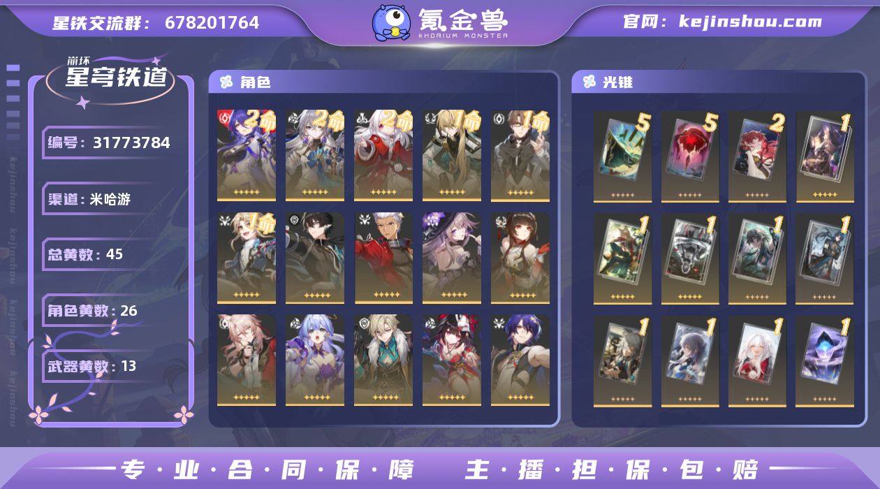 总黄数:45 五星光锥数:13 五星角色数:26 开拓等级:70 开拓者性别:女 星轨专票:1 梦华数量:0 星琼数量:720 2命黄泉,2命布洛妮娅,2命克拉拉,1命罗刹,1命瓦尔特,1命彦卿,0命丹恒·腾荒,0命Archer,0命大黑塔,0命灵砂,0命椒丘,0命知更鸟,0命砂金,0命花火,0命真理医生,0命阮·梅,0命银枝,0命托帕&账账,0命符玄,0命丹恒·饮月,0命刃,0命银狼,0命景元,0命姬子,0命杰帕德,0命白露 5精记一位星神的陨落,5精星海巡航,2精银河铁道之夜,1精向着不可追问处,1精那无数个春天,1精行于流逝的岸,1精比阳光更明亮的,1精到不了的彼岸,1精拂晓之前,1精但战斗还未结束,1精无可取代的东西,1精记忆的质料,1精记忆永不落幕 换绑材料:可提供换绑材料 邮箱状态:未绑定 psn绑定情况:否 taptap绑定情况:否 卖家说:不想玩了,一直闲置着