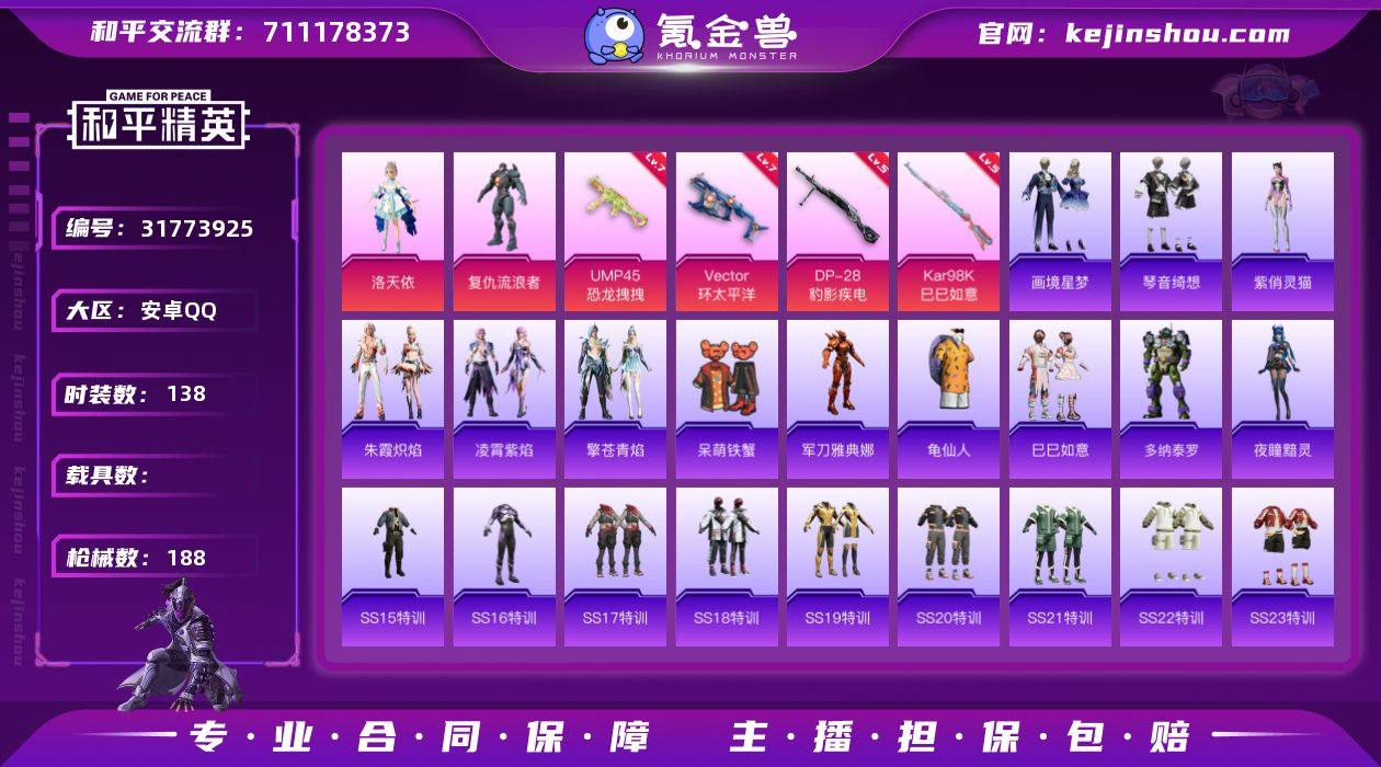 【ky406】安卓 手Q-2粉装-6特效枪-0载具-1粉色飞行器-53539热力值-12王牌印记-138套装-188枪皮 【热门品类】:角色-军刀雅典娜,套装-龟仙人 【粉色套装】:角色-洛天依,角色-复仇流浪者 【粉色枪皮等级】:UMP45-恐龙拽拽(七级),Vector-环太平洋(七级),Kar98K-巳巳如意(五级),DP-28-豹影疾电(五级) 【粉色枪皮】:ACE32-萌骑漫游,UMP45-恐龙拽拽,Vector-环太平洋,Kar98K-巳巳如意,Mk14-福马献瑞,DP-28-豹影疾电 【粉色飞行器】:炫彩糖果飞行器 【粉色降落伞】:王牌四分卫降落伞,暗夜玫瑰降落伞,洛神天依降落伞,环太平洋降落伞,未来歌姬降落伞,圣堂之誓降落伞,极意拳锋降落伞,炫彩糖果降落伞 【稀有套装】:套装-龟仙人,套装-巳巳如意,套装-雪国风尚,套装-炫彩糖果,套装-马上有钱,角色-多纳泰罗,角色-夜瞳黯灵,套装-朱霞炽焰,套装-凌霄紫焰,套装-擎苍青焰,角色-紫俏灵猫,套装-画境星梦,套装-琴音绮想,套装-红釉青花 【稀有枪皮】:AUG-冰晶雪宝,AKM-夜灯,AKM-彩虹符号,AKM-灼热熔岩,AKM-环太平洋,AKM-生命誓言,AKM-破晓战魂,AKM-虎虎生威,AKM-龙的传人,M16A4-幻世战舞者,M16A4-甜心亚梦,M16A4-蓝色火焰,SCAR-L-夜灯,SCAR-L-炫彩节奏,SCAR-L-玉兔迎春,SCAR-L-红色方程式,M416-糯团青竹,M416-红色方程式,M416-蓝色火焰,GROZA-彩虹符号,AUG-天降萌叽,AUG-耀粉歌者,AUG-青春冒险家,QBZ-彩虹符号,QBZ-洛神天依,QBZ-飞驰魅影,M762-天降萌叽,M762-奇异狩猎者,M762-彩虹符号,M762-瑞龙福将,Mk47-洛神天依,Mk47-青春冒险家,G36C-星穹咏叹调,AC-VAL-天降萌叽,AC-VAL-甜心亚梦,蜜獾-天降萌叽,蜜獾-娇憨猪猪,ACE32-画境星梦,ARX-凌霄紫焰,UZI-啾咪啾咪,UZI-天降萌叽,UZI-娇憨猪猪,UZI-炫彩节奏,UZI-红色方程式,UMP45-夜灯,UMP45-生命誓言,UMP45...