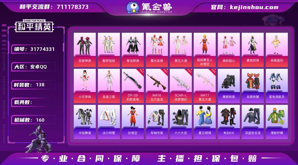 【满级五爪10粉装4特效枪可秒换绑】 安卓Q区-53824热力值-8印记-138套装-160枪皮 【10粉装】 圣堂之誓 第五大道 小可学妹 酣梦娃娃 放客神游 霞光圣骑 骨龙祭渊 飒粉甜心 黄族统领 呆萌星弥【4特效枪】 M416-五爪金龙(7级) SCAR-L-纯梦嫁纱(7级) M417-第五大道(5级) DP-28-豹影疾电(4级)【41热门】 M416-蓝色火焰 QBZ-银碳小老虎 长空猛禽 弄潮海豚 圣堂之誓 牛气冲天 霓虹街区 妙红点点 懵萌河马 绯红秘境 浪漫天命 鹰眼刺客 水银刺客 破蛋小黄鸡 小丑鱼 暗夜契约 白色伏地魔 SS27特训 SS26特训 SS25特训 SS24特训 SS23特训 SS22特训 AWM-飒粉甜心 SCAR-L-玉兔迎春 GROZA-2B战斗服款 GROZA-田园牧歌 AUG-幻影战神 M762-天降萌叽 Mk47-乌木金纹 SKS-糯团青竹 Mini14-旋转彩虹 UZI-娇憨猪猪 UMP45-蓝色火焰 DBS-彩虹符号 M249-彩虹符号 MG3-幻世战舞者 AKM-霓虹街区 SCAR-L-甜蜜誓约 呆萌铁蟹【4飞行器】 粉色滑翔尾迹 黄族统领飞行器 梦幻舞会飞行器 空岛之星尾迹 营地ID:917907924