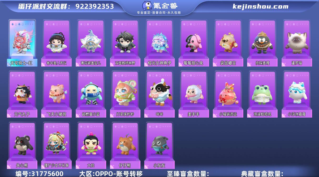 天穹骑士-虹 卷中美人芳仪,青花瓷盖宝儿,双面教师林野,极光女神典伊,超燃蛋小蓝,大娃,打菜侠妙妙,袋鼠嘟宝,飞天小猪班尼,僵尸少女不化骨,莓莓甜心兔,哞哞,美羊羊,泡澡蛙呱呱,失心熊,小浮冰霜霜,小福袋添运,小灰灰,暹罗猫,元气丸子,侦探麦嘎,仔仔熊 段位:三阶鸡蛋 卖家说:可砍价