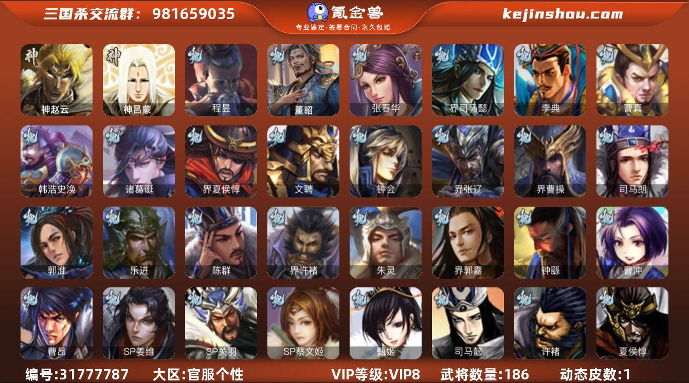 VIP等级:VIP8 官阶:中军将军 史诗武将数量:6 动态皮肤数量:1 宝珠数量:44 元宝数量:263 将魂数量:11590 卖家说:大材料中军,44.7宝珠,9.4万羽毛,1.1万将魂,神赵云,张星彩,界黄忠,董允,左慈,程昱6史诗,神吕蒙,张春华,鲁肃,蔡文姬,动态界刘备,谋高顺,谋卢植,谋小乔,孙茹,凌操,界关羽,界马超,界吕布,友庞统,势陈祗,谋姜维,彭恙,吴班,诸葛恪,界刘表,贾充,韩遂,王濬,刘琦186将,国战66将,6.3万豆,满级活树