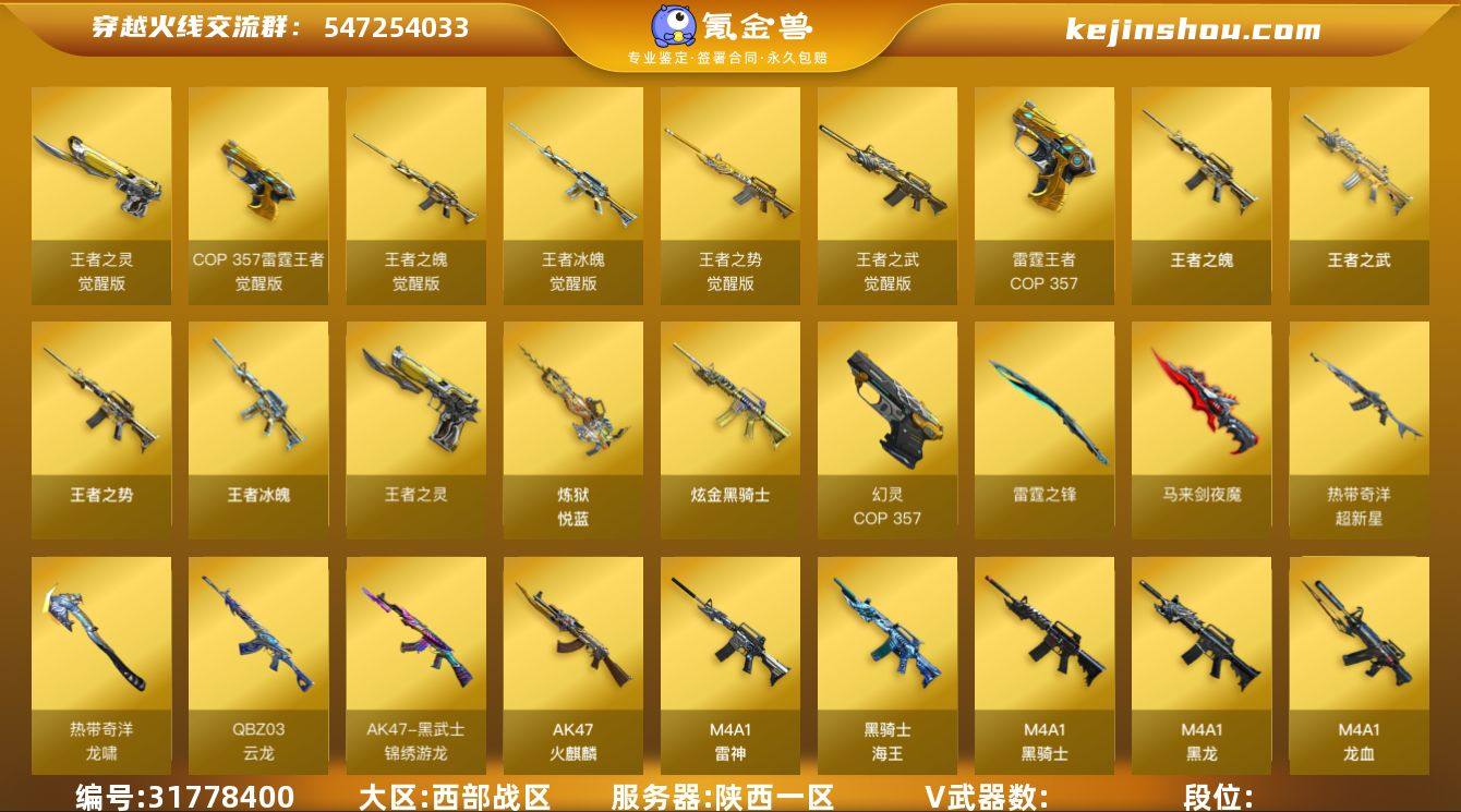 L629119 【传说影煞/幻神+音效卡(巅峰荣耀)/竞技荣光套/裁决/毁灭+音效卡(SVS16冠军)/Barrett朱雀/电玩白虎/qbz蔷薇+音效卡(冠军之薇)/qbz云龙/荣耀世冠套/火麒麟(荣耀世冠AG+巅峰荣耀+雷神)/雷神(荣耀之魄+宇航兔+荣耀世冠AG+宠儿)/黑骑士+音效卡(冠军之势)/AK天启/HK朱雀/王者之势/王者之武/超新星热带奇洋/王者冰魄/2炼狱+炼狱悦蓝/烈龙/USP雷暴/COP幻灵/柯尔特竞技荣光/荣耀世冠柯尔特*2/COP雷霆王者/柯尔特冠军之特/4防电竞教官云悠悠/4防雨棠/4防隼/4防王者影豹/冠军之刃】 会员等级6 英雄级武器数量104 【可二次实名】 【永久包赔】 【能人脸包赔】 【VIP 6】 【能排位】 【枪王】 稀有套装2 王者炫金武器11 热门武器11 英雄级武器37 稀有武器6 暴走生化2 挑战大师2 角色8 稀有皮肤35 音效卡5 投掷武器14 稀有套装:竞技荣光套,荣耀世冠套; 王者炫金武器:烟雾弹-雷霆王者,王者之势,炼狱-悦蓝,王者之魄,COP 357-雷霆王者,闪光弹-雷霆王者,高爆手雷-雷霆王者,王者之灵,王者冰魄,王者之武,炫金骑士; 热门武器:HK417-朱雀,COP 357-幻灵,柯尔特-冠军之特,M200-竞技荣光,USP-雷暴,荣耀世冠-柯尔特,荣耀世冠-雷神,荣耀世冠-龙啸,荣耀世冠-火麒麟,M200-幻神,Knife-冠军之刃; 英雄级武器:屠龙,沙鹰-天神,加特林-炼狱,Barrett-毁灭,Barrett-极光,超新星-热带奇洋,龙啸-热带奇洋,QBZ03-云龙,AWM-天龙,尼泊尔-雷霆,黑武士-锦绣游龙,龙啸-烈火龙威,无影-神兵利器,AK-47-猩红传说,白虎-电玩蓝兔,Barrett-暗月传说,Barrett-朱雀,柯尔特-竞技荣光,擎天-竞技荣光,黑骑士-海王,AA-12-雷霆,马来剑-夜魔,AK12-天启,沙鹰-修罗,M4A1-黑龙,M4A1-雷神,AK47-B-战神,AK47-B-战士,麒麟刺,AWM-裁决,M4A1-龙血,龙啸,汤姆逊-烈龙,AK47-火麒麟,QBZ03-金色蔷薇...