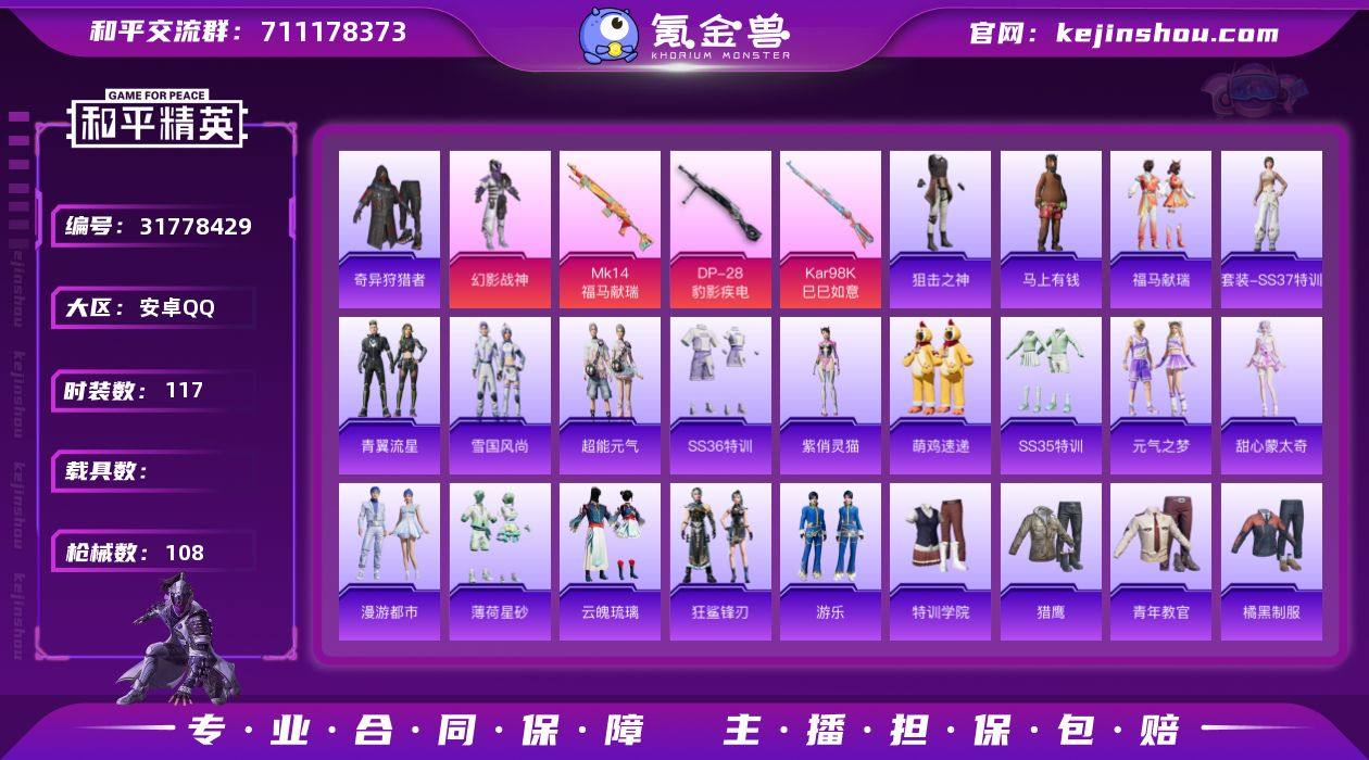 【0载具 3特效枪 1粉装 108枪皮 117套装】牛仔上衣 暗影哥特 地铁号满天赋 套装-浪漫天命,套装-奇异狩猎者,套装-暗影哥特,套装-幻影战神 Kar98K-巳巳如意,Mk14-福马献瑞,DP-28-豹影疾电13本体 奇异狩猎者 地铁多装备,编号:ZPRMS87