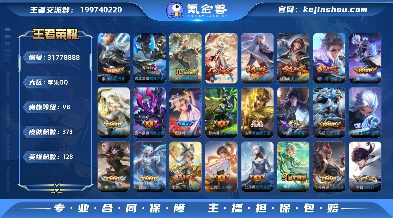 贵族8/皮肤373/典藏1/传说33/史诗101/英雄128/孙权全皮/刘备全皮/敖隐全皮/蒙恬全皮/澜全皮/夏洛特全皮/戈娅全皮/影全皮/海诺全皮/鸣剑·曳影/幽冥之眼/时之恋人-刘备/云缨神骥越千峰/神树通天/愿照·九州拓/幻光神枪/鸣野蒿/澜逐花归海/电玩·雷克斯/百相守梦(张飞)/记忆之芯/浮生妄/山海·琳琅生/山海·苍雷引/诗剑行/碎云/无双飞将/寅虎·赤拳/淬星耀世/游龙清影/默契交锋-兰陵王/绛天战甲/炽阳神光/启明星使/云鹰飞将/一念神魔/猫影幻舞/久胜战神/黄金狮子座/胖达荣荣/凤求凰/末日机甲-孙尚香/地狱之眼/超时空战士-狄仁杰/蔡文姬夏日便利店/大乔绒语心约/虞姬夏日便利店/天穹之誓(s36)/阴阳师/皇家上将/蔷薇恋人/狮舞东方/玩趣恶龙/奇幻香踪/幻夜卜梦/云间偶戏/无心/暗影游猎/山海·玄木吟/魔术师/万华元夜(s22)/沙漠行僧(s26)/海滩派对/百相守梦(关羽)/演武夺筹(s23)/一生所爱/飞衡/傲雪梅枪/午后时光/金庭之子(s27)/瑞麟志/默契交锋-花木兰/至尊宝/如梦令-后羿/百相守梦(刘备)/云中旅人(s29)/驱傩正仪(s24)/潮玩骑兵/朔望之晖/五谷丰年/火炮绅士/千军破阵(s25)/星空之诺/大漠名商(s28)/匿光破解者/擒涛扼浪(s31)/电玩高手/胡桃异想国/时之祈愿-云中君/梁祝/拒霜思/暖冬·兔眠/玲珑珍味/探海日志(s32)/匿光追影者/海盐诗旅(s30)/星界游侠/驭风魔法/流音漫舞/地狱燃心/江河有灵/古海寻踪(s33)/百解令(蒙犽)/蒙恬荣光圣徽/高渐离燃音魔法/妲己灵卜魔法/鬼谷子天穹祈灯(S34)/妄想食味/龙武盛年/蔬乡物语(鲁班七号)/蔬乡物语(李元芳)/剑破天穹(s35)/程咬金群星魔术团/青焰无极/苍威无极/海诺心动手记/刘备异域游侠/熔金海岸/噬灭天穹(s37)/谧流熔炉/虚灵犬护/星界战将/九幽镇关/破空之剑/神迹守卫/百相守梦-百里守约/百相守梦-老夫子/百相守梦-周瑜/百相守梦-孙策/光弋星穹/往忆晖光/线条小狗-周瑜/紫霞仙子/暗夜猫娘/未...