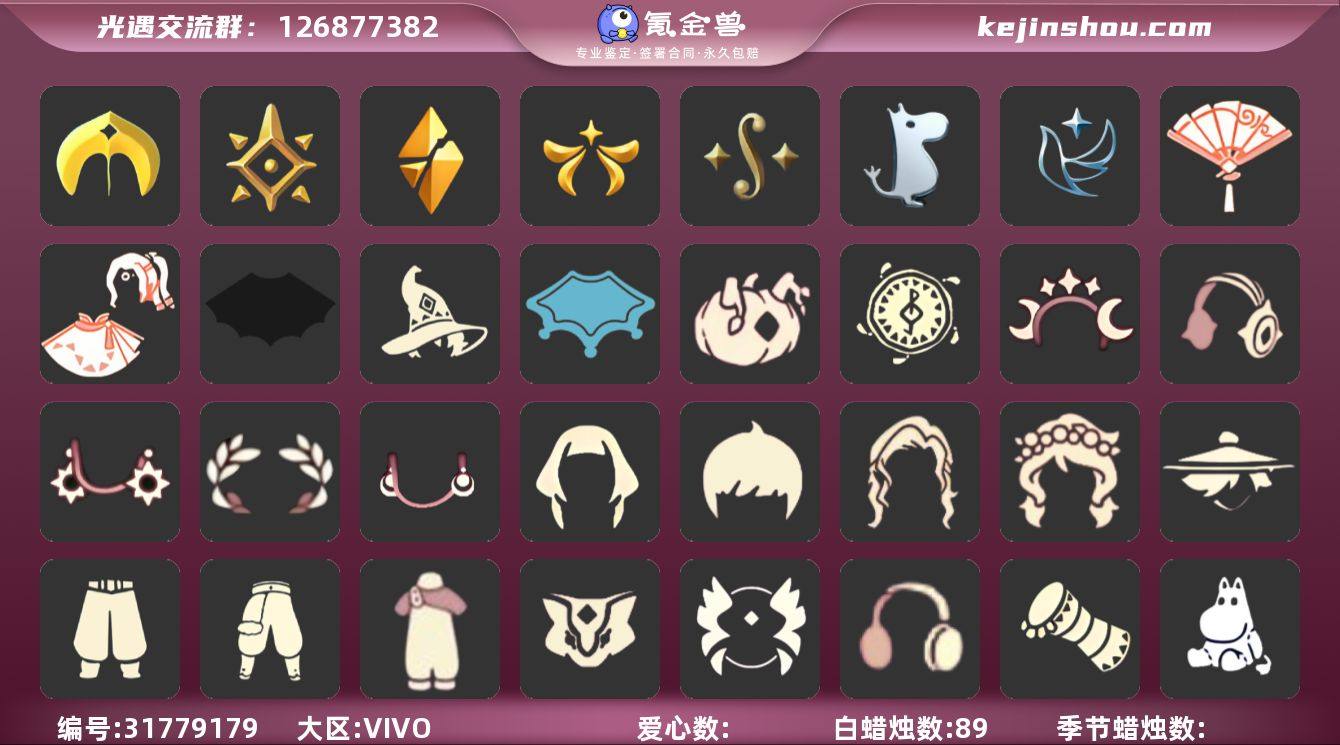 账号类型: 手机账号 季节已毕业: 圣岛季,预言季,梦想季,小王子季,表演季,欧若拉季,集结季,夜行季,追忆季,九色鹿季,彩染季,迁徙季 完成地图: 晨岛,雨林,霞谷,暮土 珍稀物品: 鳐鲲斗篷,阿努比斯(狗头),白枭,透明蝶翼斗,玫瑰花 礼包: 蝙蝠套,巫师,围巾,九色鹿角,兔子鞋,白绒金,瑞雪,人声乐器,橘子,南瓜,枯角,星月头饰,彩虹耳钉,彩虹耳机,蝴蝶结,伯爵斗篷,透明蛛丝,新年耳钉,创始人,满月耳坠,献瑞折扇礼包,风之旅人白袍,活力海牛礼包 裤子: 武士裤,背带裤,搓澡巾,击剑裤,王子服,蓝绿裤,飞天裤 面具: 阿努比斯,凤凰面具,贴花面具,夜行毕业面具,黄眉企鹅面具,辉光羚羊面具 面饰: 红耳机,黑框眼镜 项链: 围巾 发型: 若笠,虚荣,小王子发型,留辫蘑菇头,飞天盘发 头饰: 行军锅头盔,蓝色音乐会,平顶帽 斗篷: 海洋斗,蟑螂斗,绿芽,粉红绒毛斗篷,黄色连帽披风,燕尾斗篷,彩染围巾斗篷 配饰: 雨伞,高音钢琴,相机,玫瑰花,圆鼓,蓝色手碟,鲲灯 亮点: 【优质装备】:预言季,阿努比斯(狗头),表演季,白枭(帝企鹅发),武士裤,圣岛季,梦想季,小王子季(王子季),鳐鲲斗篷,透明蝶翼斗,欧若拉季(欧若拉),行军锅头盔(六边锅帽子)(双耳锅帽子),高音钢琴(白色高脚钢琴),集结季,玫瑰花,夜行季,追忆季,相机(季卡相机),九色鹿(九色鹿季),王子服(小王子套装),蓝绿裤(高领舞服),飞天裤(柔缎花边连)(九色鹿丝带裤),蟑螂斗(凤凰斗篷),围巾(肩带),凤凰面具,贴花面具(丛林黑面具),夜行毕业面具(棕熊面具),黄眉企鹅面具,黑框眼镜(粗框眼镜),小王子发型,留辫蘑菇头,粉红绒毛斗篷(绒毛斗篷),黄色连帽披风(连帽斗篷)(斜边队长斗篷),燕尾斗篷,圆鼓(手拍大鼓),蓝色手碟(毕业手碟),鲲灯(追忆之书),辉光羚羊面具,彩染季,飞天盘发(九色鹿丸子头),蝙蝠套(蝙蝠斗篷)(南瓜头),风之旅人白袍(超凡风之旅人礼包),红耳机,围巾(小王子斗篷)(小王子围巾),九色鹿角(神鹿祝福头...