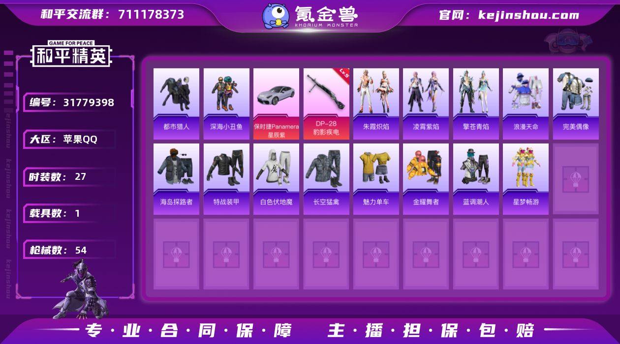 27套装/枪械1/装备59/载具1/战备41/王牌印记2/热力值12558/五级DP-28-豹影疾电/浪漫天命/都市猎人/深海小丑鱼/保时捷Panamera(星辰紫)/DP-28-豹影疾电/炫彩糖果飞行器/喜羊羊与灰太狼降落伞/炫彩糖果降落伞/炫彩糖果/朱霞炽焰/凌霄紫焰/擎苍青焰/AUG-冰晶雪宝/SCAR-L-炫彩节奏/M416-蓝色火焰/ARX-凌霄紫焰/UZI-天降萌叽/UZI-影袭/Vector-生命誓言/JS9-凌霄紫焰/Kar98K-影袭/SKS-炫彩节奏/Mini14-穿刺龙虾/AMR-喜羊羊与灰太狼/DBS-幻彩电音/M249-糯团青竹/MG3-幻世战舞者/MG-36-凌霄紫焰/P92-凌霄紫焰/爆炸猎弓-喜羊羊与灰太狼/平底锅-凌霄紫焰/完美偶像/海岛探路者/特战装甲/白色伏地魔/长空猛禽/魅力单车/金耀舞者/蓝调潮人/星梦畅游/幻影战神头盔(2级)/幻影战神头盔(1级)/深海小丑鱼背包(2级)/深海小丑鱼背包(1级)