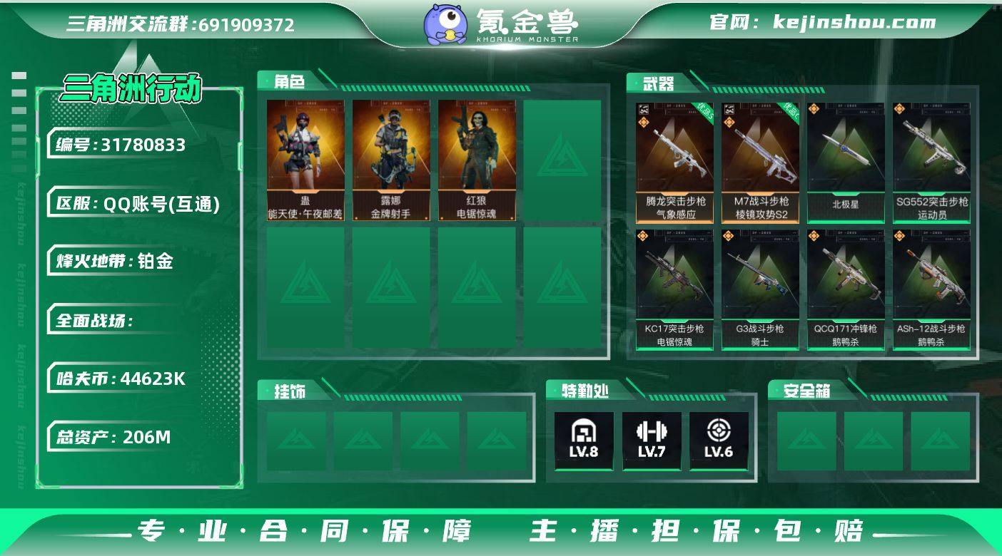 "YXB-满体-s8赛季通行证-44623k哈伏币-总资产206m流动资产170-60烽火等级-铂金-23战场等级-列兵 【干员外观】:蛊-能天使午夜邮差,红狼-电锯惊魂,露娜-金牌射手 【近战皮肤】:近战-北极星,近战-黑鹰 【特勤处】:仓库8-训中满级-靶场6 部门23322 【典藏外观】:腾龙突击步枪-气象感应优品S(毒),M7战斗步枪-棱镜攻势S2优品C 【传说外观】:M4A1突击步枪-蚀金玫瑰,M4A1突击步枪-阿米娅,ASh-12战斗步枪-鹅鸭杀,SG552突击步枪-运动员,SCAR-H战斗步枪-启航,G3战斗步枪-骑士,CAR-15突击步枪-阿米娅,腾龙突击步枪-捞点薯条,K437突击步枪-北极星,KC17突击步枪-电锯惊魂,Vector冲锋枪-能天使-午夜邮差,勇士冲锋枪-能天使-午夜邮差,QCQ171冲锋枪-北极星,QCQ171冲锋枪-鹅鸭杀,M250通用机枪-骑士之心,QJB201轻机枪-鹅鸭杀,M14射手步枪-电锯惊魂,M14射手步枪-蛮荒,R93狙击步枪-维什戴尔,AWM狙击步枪-捞点薯条,93R-捞点薯条"