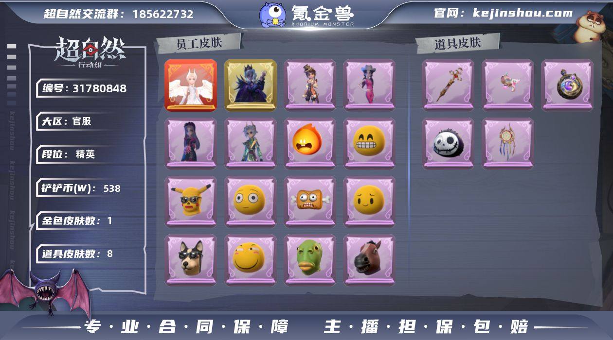 超自然3金16紫5魔盒赤炼白泽玛丽黑月情公主莓果 GX1755 金皮3;紫皮16;道具皮23;皮肤:小黄-遗失的童话,薇薇安-圣光之谕,爱丽丝-血色中的玛丽,阿念-灵昭鹿鸣,逍遥-泽引山海,莉莉-情公主,薇薇安-黑月挽歌,逍遥-绣春逍影,爱丽丝-耀眼的你,莉莉-莓果陷阱,小黄-霓裳踏雪,零-赤炼将军,小黄-呱呱雨衣,爱丽丝-丝缕哀歌,阿念-王子与骑士,艾伦-绒绒对决,阿念-庆宴绮愿,爱丽丝-瑞羽衔春,巫铃儿-素影瑶光;道具:腰包-月下莲台,腰包-宝剑八,短管猎枪-星光的裁决,摸金符-花落精绝,转轮手枪-新星时代,刺刀-赤色之刃,铲子-赞萌波板糖,刺刀-紫气东来,铲子-圣心之泪,传送按钮-幻宠之门,急救包-蔷薇物语,铲子-焰骨,葫芦-伏妖塔,刺刀-碧络琅环,铲子-龙鳞,桃木剑-永眠曲,短管猎枪-赞萌露比水枪,传送按钮-逆时审判,长鞭-小狗蛇点点鞭,腰包-绯红柴郡猫,黄牛能量饮料-珍珠芭乐莓莓,音响-鸣沙鼓,闪光弹-金戈玄铜;饰品:头饰-滑稽头套,头饰-咬咬鲨头套,头饰-大葱明头套,头饰-呆滞头套,头饰-龙傲天头套,头饰-鱼头怪头套,头饰-嘻嘻头套,头饰-炙热烧烤,头饰-驼半仙头套,头饰-烛光纪念,头饰-面具马头套,头饰-火爆了头套,头饰-蒜了八,头饰-烈焰红唇头套,头饰-鳄霸天头套,头饰-萨卡班甲鱼头套,头饰-哈士奇头套,头饰-小狗蛇点点头套,头饰-卑微头套,头饰-马上有钱,头饰-粽小宝头套,头饰-哞哞牛头套,头饰-像素朋克墨镜,头饰-后室幸存者头套,挂饰-天使消失的年代,挂饰-小鲨包包,挂饰-小小玛丽,背饰-梵音莲华,背饰-牛啤背包,背饰-兔先生的时钟,背饰-天使的呼唤,背饰-云梦之星;动作:动作-新年摇,动作-敲门舞,动作-九万字舞,动作-心跳摇,动作-青海摇,动作-luvaboy,动作-孤身摇,动作-舞台中心,动作-小雨摇,动作-山楂树之舞,动作-KT猫摇,动作-带你逃跑吧,动作-拜年,动作-举牌,动作-痞帅进行曲,动作-律动迪斯科,动作-要糖,动作-抬手;工牌背景:工牌...