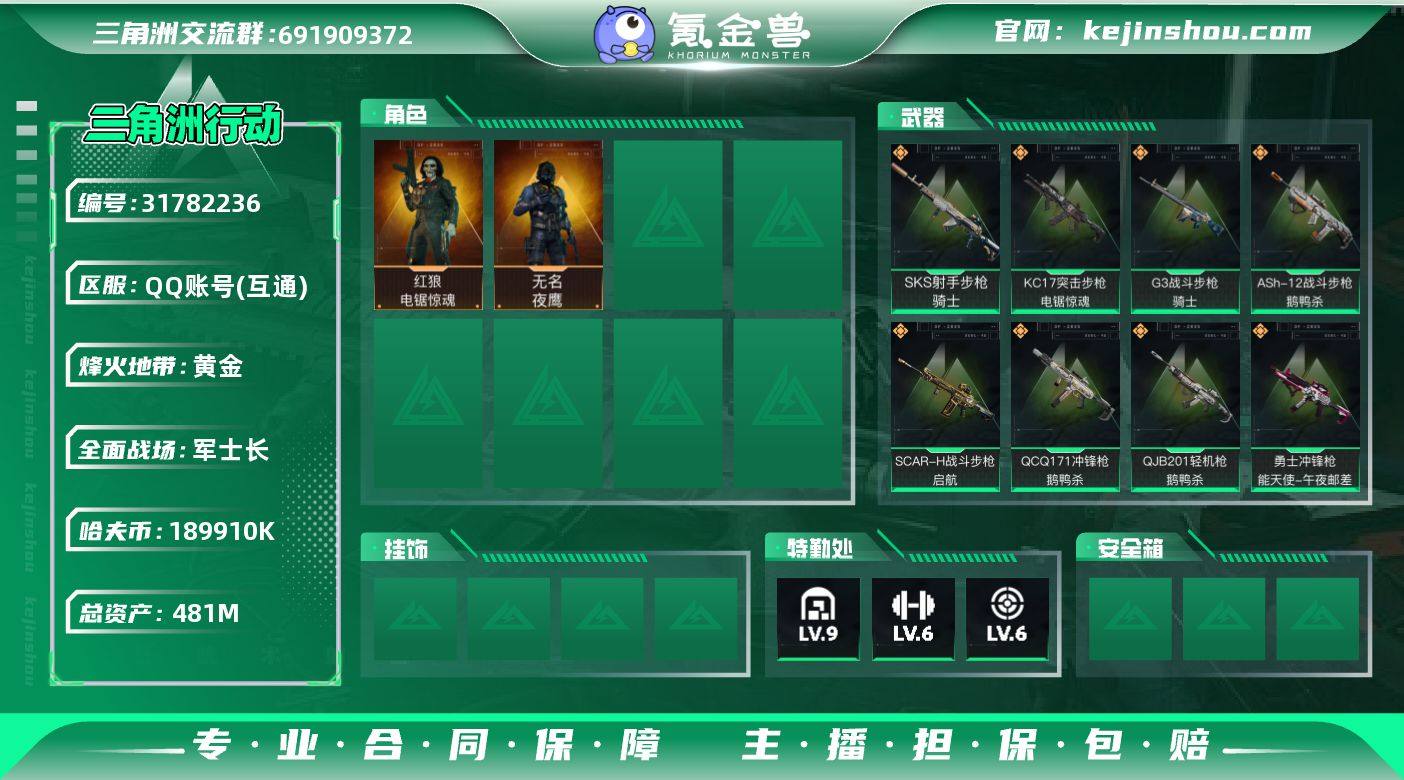 【Hsj575】【特价秒杀】【总资产481M流动资产437M哈夫币18991w】可二次--全面战场等级:50/烽火地带等级:60【处刑者】 【干员外观】:无名-夜鹰,红狼-电锯惊魂 【近战皮肤】:近战-处刑者,近战-黑鹰 【传说外观】:M4A1突击步枪-阿米娅,AKM突击步枪-锦绣,ASh-12战斗步枪-鹅鸭杀,AK-12突击步枪-夜鹰,AK-12突击步枪-特斯拉线圈,SCAR-H战斗步枪-启航,G3战斗步枪-骑士,CAR-15突击步枪-阿米娅,腾龙突击步枪-捞点薯条,K437突击步枪-锦绣,KC17突击步枪-电锯惊魂,UZI冲锋枪-特斯拉线圈,SMG-45冲锋枪-骑士,SMG-45冲锋枪-锦绣,SR-3M紧凑突击步枪-特斯拉线圈,勇士冲锋枪-能天使-午夜邮差,QCQ171冲锋枪-鹅鸭杀,PKM通用机枪-荼蘼,QJB201轻机枪-鹅鸭杀,SKS射手步枪-骑士,SR-25射手步枪-水墨云图,AWM狙击步枪-捞点薯条,93R-捞点薯条,复合弓-黑·天际线 【史诗外观】:SR-25射手步枪-天命,SVD狙击步枪-檀劫铳影,AKM突击步枪-林中猎手,QBZ95-1突击步枪-曙光,ASh-12战斗步枪-刀锋,ASh-12战斗步枪-守夜人,K416突击步枪-冬日风情,K416突击步枪-阿萨拉特攻,M16A4突击步枪-竞赛选手,AUG突击步枪-蝮蛇,SG552突击步枪-尖端治疗,SG552突击步枪-深海恐惧,SCAR-H战斗步枪-囚徒,G3战斗步枪-战场英杰,AS Val突击步枪-尖端治疗,腾龙突击步枪-猎鳄行动,KC17突击步枪-缄默情歌,MP5冲锋枪-深海恐惧,MP5冲锋枪-战术竞备,P90冲锋枪-暗影猎手,P90冲锋枪-莫斯提马,Vector冲锋枪-阿萨拉文明,Vector冲锋枪-猎鳄行动,SMG-45冲锋枪-阿萨拉特攻,SR-3M紧凑突击步枪-英雄,SR-3M紧凑突击步枪-战术竞备,勇士冲锋枪-深海恐惧,QCQ171冲锋枪-禁卫,M1014霰弹枪-林中猎手,S12K霰弹枪-曙光,PKM通用机枪-蝮蛇,PKM通用机枪-守夜人,M250通用机枪-囚徒,SVD狙击步枪-阿萨拉工艺,SVD狙击步枪-暗夜猎手,M14射手步...