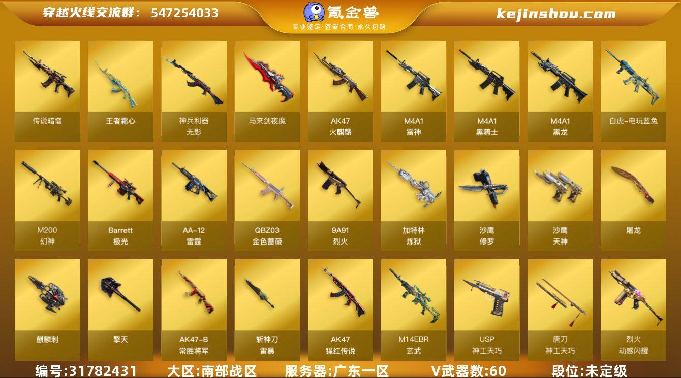 广东一区-68V-6王者武器数-0炫金武器数 【传说武器】:传说暗裔 【热门武器】:传说暗裔,QBZ03-金色蔷薇,M14EBR-玄武,M200-幻神,白虎-电玩蓝兔,柯尔特-冠军之特,M4A1-黑骑士*2,加特林-炼狱,COP-白鲨,沙鹰-修罗*4,Knife-冠军之刃,金刚伞 【王者炫金武器】:王者霜心 【音效卡】:M200-幻神音效卡,M4A1-黑骑士音效卡,QBZ03-金色蔷薇音效卡 【皮肤】:幻神-CFS2022,幻神-荣耀世冠白鲨2023 皮肤,QBZ03-冠军之薇,雷神-荣耀之魄,雷神-星空,雷神-宇航兔皮肤,火麒麟-轻羽皮肤,火麒麟-心动糖果,毁灭-荣耀之怒,毁灭-黑大圣皮肤,M4A1-千变-孔明皮肤,黑骑士耀金皮肤,AK47-B-常胜将军-曹操,AK47-B-常胜将军-孙权*2,麒麟刺-萌杀皮肤 【角色】:雨棠,鹰,王者-瞳-闭月羞花,王者玲珑,王者沙漠玫瑰,乔伊教练,暗夜-X,芳心审判者,虎妞,嘉年华灵狐,兰-海滩派对,灵狐者-X,灵狐者-七夕宝贝,龙儿,龙儿-小淘气,玫瑰花神,萌儿,潘多拉-X,青霞仙子,斯沃特-X,兔囡囡,雪莉杨-摸金校尉,职业选手 【人偶武器】:COP-白鲨,AWM-灵狐-15周年嘉年华,迷你深渊冰龙,迷你裂空之翼*2,迷你波特博士*2,夺魂,迷你牛牛,生化手雷-机甲核心,深渊终结者手雷,闪光弹-貂蝉,高爆手雷-大乔,迷你艾比,迷你超能女侍 【暴走生化】:超级对讲机 【挑战大师】:冰龙粉碎者-白马银枪,试炼破坏者III,神圣爆裂者-末日III 【英雄级武器】:AK47-火麒麟*2,M4A1-黑龙,M4A1-雷神,M4A1-黑骑士*2,M14EBR-玄武,无影-神兵利器,QBZ03-金色蔷薇,9A91-烈火,烈火-动感闪耀,AK-47-猩红传说,AK47-B-常胜将军,王者白虎-觉醒版,QBZ-03-王者蔷薇-觉醒版,白虎-电玩蓝兔,白虎之魄-觉醒版,Barrett-极光,M200-幻神,王者之决-觉醒版,王者星神-觉醒版,加特林-炼狱,AA-12-雷霆,沙鹰-修罗*4,沙鹰-天神,柯尔特-冠...