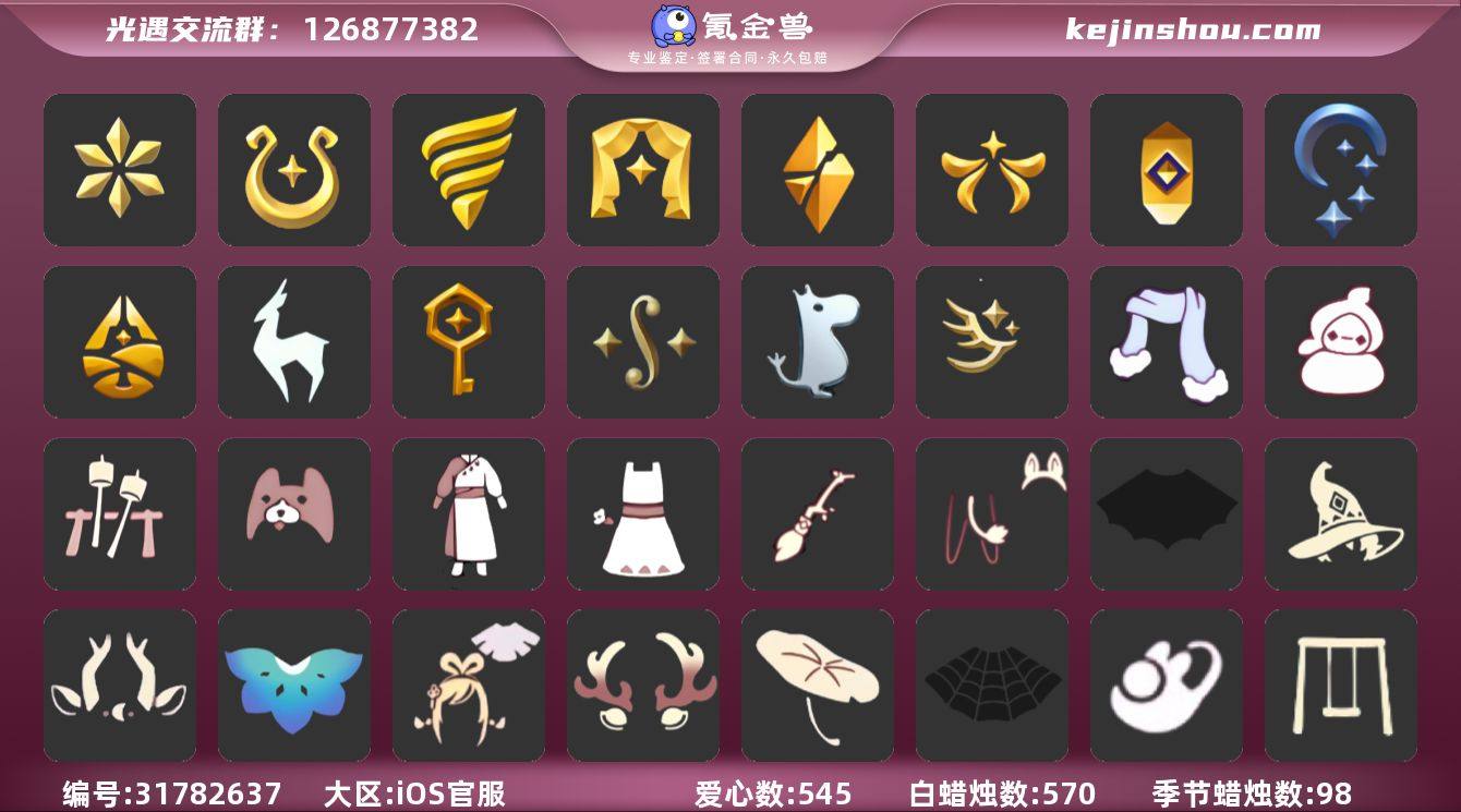 账号类型: 邮箱账号 季节已毕业: 音韵季,魔法季,潜海季,表演季,破晓季,欧若拉季,夜行季,追忆季,归巢季,九色鹿季,筑巢季,二重奏季,姆明季,迁徙季 完成地图: 全图毕业 珍稀物品: 白枭,白鸟头,魔法季耳坠,咖喱 礼包: 蝙蝠套,巫师,九色鹿角,莲花斗,绊爱,鹿角,荷叶伞,蜘蛛斗,兔子鞋,秋千,茶桌,茶壶,餐桌,白绒金,福娃,吉他,灯笼,鲤鱼套,橘子,贝壳,黄伞,兔子,南瓜,雪花,鲤鱼,竖琴,手碟,电吉他,tgc,彩虹耳钉,彩虹耳机,雪怪斗,新年裤,蝴蝶结,奥利奥,海螺,四叶草,暗彩装扮,向日葵套,滑板,透明蛛丝,飞蛾套,雪人鞋,新年耳钉,龙纹斗,浪漫流星斗,创始人,满月耳坠,锦标赛桂冠,线框斗,姆明饰品套装,恶作剧飞行扫帚,向日葵连衣裙,龙鳞束身长袍,小狗周年发饰,篝火点心礼包,冬日围巾斗篷,小雪人头饰 裤子: 武士裤