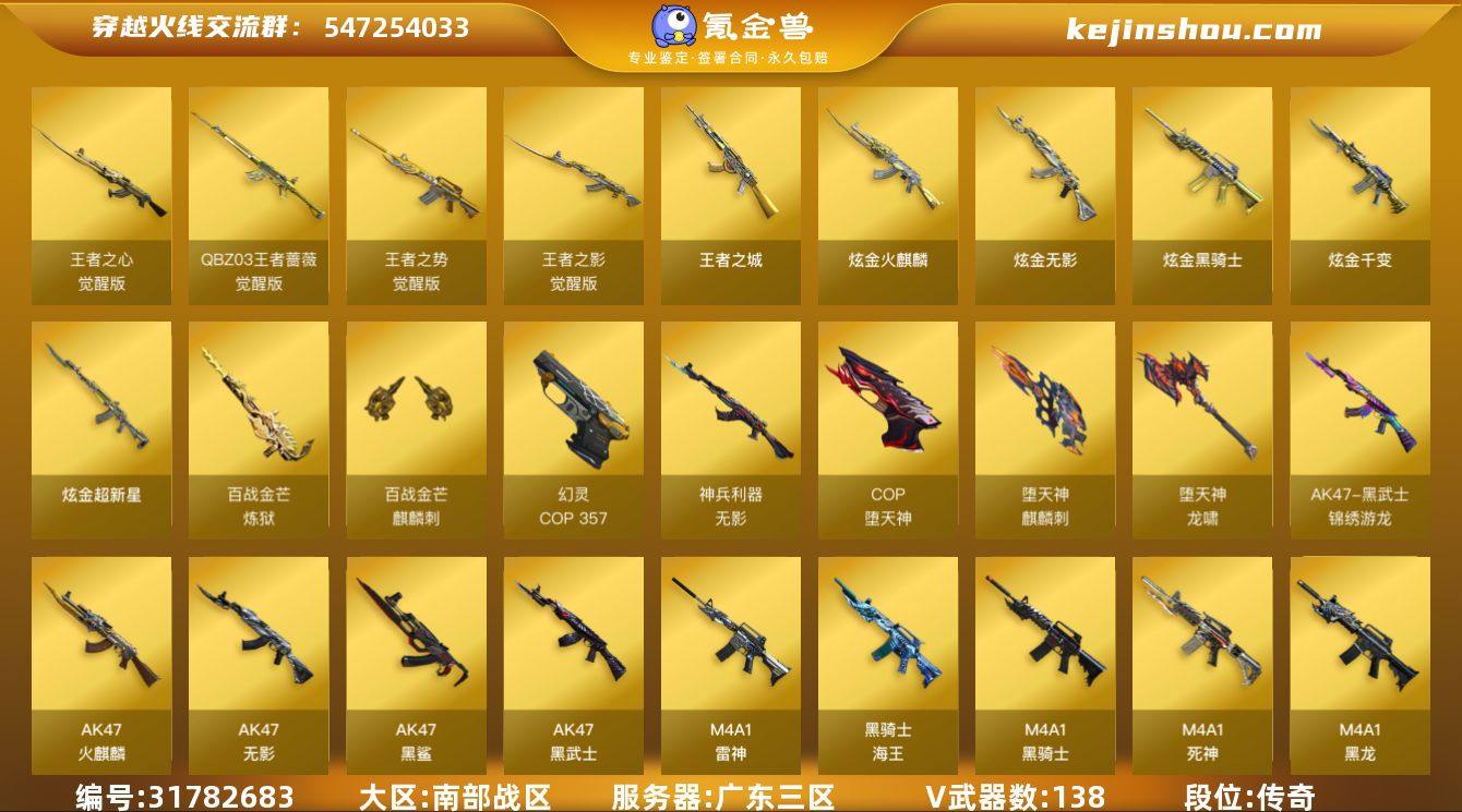 广东三区-148V-7王者武器数-5炫金武器数 【热门武器】:M200-幻神,死亡之眼,M4A1-黑骑士,汤姆逊-烈龙*9,RPK-盘龙,加特林-炼狱,斯泰尔-蝴蝶,雷神-小红,COP-堕天神,COP 357-幻灵,沙鹰-修罗*5,金刚伞 【王者炫金武器】:王者之城,炫金火麒麟,炫金骑士,炫金无影,炫金千变,炫金超新星 【音效卡】:AK47-火麒麟音效卡,M4A1-黑骑士音效卡,炼狱-百战金芒-庆典舞曲音效卡 【皮肤】:雷神-暗月,雷神-能量核心,雷神-虎将,雷神-烈虎皮肤,M4A1-再燃火线,火麒麟-雷神,火麒麟-华夏之心,火麒麟-轻羽皮肤,火麒麟-百城,火麒麟-心动糖果,毁灭-黑大圣皮肤,M4A1-千变-孔明皮肤,黑龙-能量核心,黑龙-暗月*2,无影-能量核心,无影耀金皮肤,死神-机甲核心皮肤,AK47-黑武士-361,天启-暗月,战神-粉色甜心皮肤*3,战神-紫绶金章皮肤*9,战神-流金岁月皮肤*4,AK47-B-常胜将军-曹操,AK47-B-常胜将军-刘备,AK47-B-常胜将军-孙权,AWM-天龙-传奇70KG,极光-能量核心,修罗-能量核心,修罗耀金皮肤,轻型军用手斧-再燃火线,麒麟刺-萌杀皮肤 【角色】:葵,樱,迷迭香,乔伊教练,修道士,云海玲珑,葵-阿尔法武装,炽天使,空,暗夜-X,初恋灵狐,芳心审判者,风暴女*2,虎妞,嘉年华灵狐,娟娟,兰-空鹰,兰-新年限定,猎狐者-追月,灵狐-花神,灵狐者-黄金海岸,灵狐者-七夕宝贝,灵狐者-职业经理,龙儿,龙儿-小淘气,曼陀罗-X,曼陀罗-礼服,萌儿,潘多拉-X,潘多拉-甜心教官,潜龙队-X,邱刚敖,青霞仙子,斯沃特-X,蜀雪,铁骑荣耀,兔囡囡,维纳斯,新娜塔莎,雪莉杨,雪莉杨-摸金校尉,夜玫瑰-幻能朋克,樱-战斗天使,影武者-X,职业选手 【人偶武器】:雷神-小红,天龙-曼陀罗,火麒麟-灵狐,斯泰尔-蝴蝶,巴雷特-零-水下丽影*2,AWM-灵狐-15周年嘉年华,迷你深渊冰龙,迷你牛魔王,夺魂,迷你牛牛...