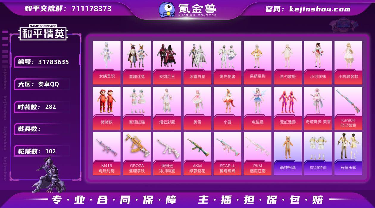 【新年特价出售】热力值:38896,收藏分:31551,16粉装,7粉枪,18粉色战备,80套装,102枪械,181装备,3滑翔尾翼,34降落伞,卓越收藏家:51级;等级:Lv.47 历史最高段位:超级王牌14星 当前段位:英勇.黄金Ⅲ;王牌印记4次; 【热门品类】:套装-糯粉咩咩,小恶魔头饰;【粉色套装】:粉装-冰霜白皇,粉装-童趣迷兔,粉装-炙焰红王,粉装-寒光使者,角色-小可学妹,角色-呆萌星弥,角色-白勺歌姬,角色-小叽联名款,粉装-蜜语绒猫,玩偶服-猪猪侠,粉装-霓虹漫游,角色-烟云彩露,角色-电磁星,角色-小蓝,角色-美雪,角色-女娲灵识;【粉色枪械】:M416-电玩时刻[5级],SCAR-L-锦绣绵绵[5级],GROZA-焦糖拿铁[7级],AKM-绿萝繁花[5级],Kar98K-巳巳如意[5级],汤姆逊-冰川粉黛[6级],PKM-江南烟雨[4级];【粉色滑翔尾翼】:萌物绒绒飞行器,太空嘟嘟飞行器,镜光幻境飞行翼;【粉色降落伞】:江南烟雨降落伞,阿狸红降落伞,巴啦啦小魔仙降落伞,春暖花开降落伞,童趣迷兔降落伞,星空武士降落伞,圣堂之誓降落伞,精灵梦叶罗丽降落伞,小叽联名款降落伞,金丰海韵降落伞,白勺歌姬降落伞,第五大道降落伞,彩装战姬降落伞,闲梦青缨降落伞,鬼刀降落伞