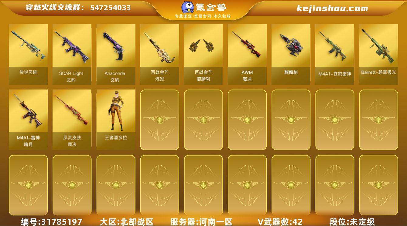 【自带包赔 最高三倍】:北部战区:河南一区-LV70-上校3-未定级-42V-2王者武器数-0炫金武器数 【传说武器】:传说灵眸 【热门武器】:传说灵眸,沙鹰-修罗*3 【音效卡】:Barrett-碧霄极光音效卡,麒麟刺-百战金芒-盛典舞曲音效卡,炼狱-百战金芒-庆典舞曲音效卡 【皮肤】:AWM-裁决-凤灵皮肤,雷神-暗月,修罗-百战金芒 皮肤 【角色】:机械姬(四防),王者潘多拉,玄豹,龙儿,曼陀罗-礼服,潘多拉-甜心教官,雪莉杨-摸金校尉 【人偶武器】:生化手雷-机甲核心,异变清道夫-蛇影双骄 【挑战大师】:冰龙粉碎者-白马银枪 【英雄级武器】:AWM-裁决,麒麟刺,沙鹰-修罗*3,SCAR Light-玄豹,炼狱-百战金芒,盘龙-悦心-觉醒版,炼狱-悦蓝-觉醒版,Anaconda-玄豹,USP-冥王*2,麒麟刺-百战金芒,丛林匕首-玄豹*2,高爆手雷-玄豹*6,闪光弹-玄豹*7,烟雾弹-玄豹*7,M4A1-苍鸣雷神,Barrett-碧霄极光 道具、段位等以实际验号为准。如账号因没有维护,赛季更新等不可抗因素发生变化,不属于账号质量问题"