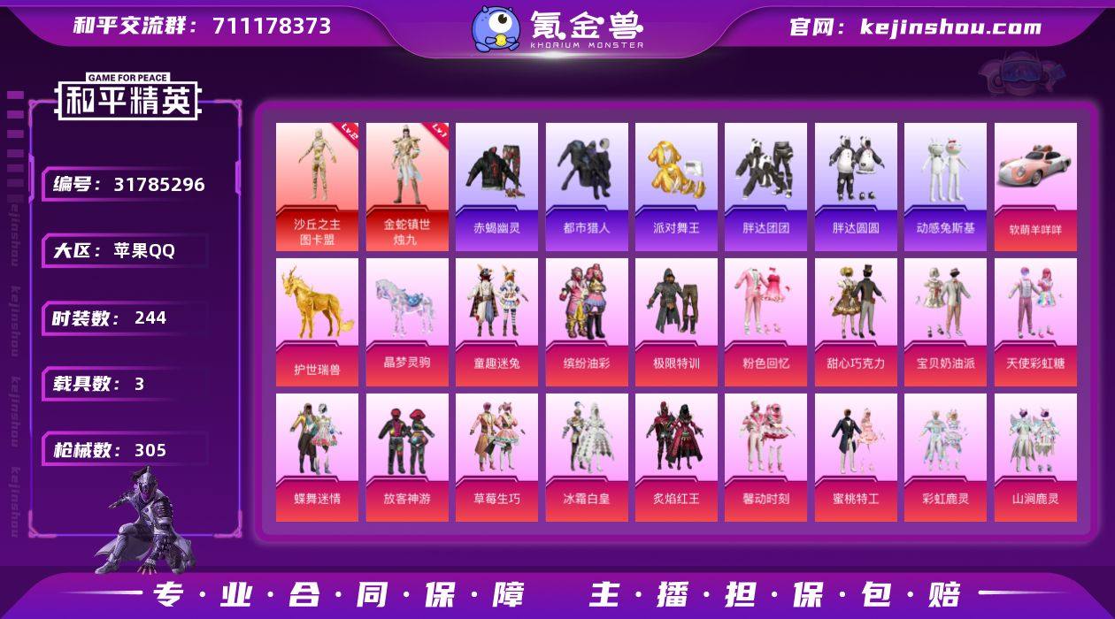 【1569】苹果 手Q-无敌战神框-2神装-37粉装-19特效枪-3载具-14粉色飞行器-123634热力值-16王牌印记-244套装-305枪皮 【红色神装等级】:金蛇镇世-烛九(一级),沙丘之主-图卡盟(二级) 【红色角色神装】:金蛇镇世-烛九,沙丘之主-图卡盟 【热门品类】:粉装-童趣迷兔,粉装-缤纷油彩,套装-浪漫天命,套装-赤蝎幽灵,套装-都市猎人,套装-派对舞王,套装-小丑鱼,套装-胖达团团,套装-胖达圆圆,套装-动感兔斯基人偶服,套装-龟仙人,套装-潮萌小黄鸭,套装-暗影哥特,套装-粉红小猪,套装-红熊茄茄 【粉色载具】:软萌羊咩咩,僚机-萌兔起飞,护世瑞兽,晶梦灵驹 【粉色套装】:粉装-极限特训,粉装-粉色回忆,粉装-甜心巧克力,粉装-宝贝奶油派,粉装-天使彩虹糖,粉装-蝶舞迷情,粉装-缤纷油彩,粉装-放客神游,粉装-草莓生巧,粉装-冰霜白皇,粉装-童趣迷兔,粉装-炙焰红王,粉装-馨动时刻,粉装-蜜桃特工,粉装-彩虹鹿灵,粉装-山涧鹿灵,角色-洛天依,粉装-岚岚物语,粉装-薄荷物语,粉装-恐龙拽拽,粉装-橘柚倾心,粉装-紫电风暴,粉装-甜梦小狐,粉装-暖熊萌萌,粉装-傲雪凌霜,粉装-彩虹甜喵,粉装-冰川幽秘,粉装-寒光使者,粉装-暗夜鎏金,粉装-第五大道,角色-呆萌星弥,粉装-蜜语绒猫,角色-千金淑猫,角色-樱桃泡泡,粉装-星穹咏叹调,角色-绯穹魔姬,角色-奇迹舞步 美雪 【粉色枪皮等级】:AKM-甜心宝贝(七级),SCAR-L-青春物语(一级),SCAR-L-甜梦小狐(五级),M416-心之恋语(七级),M416-墨龙九天(三级),GROZA-焦糖拿铁(五级),AUG-许七安(六级),UMP45-恐龙拽拽(七级),P90-沙丘之主(二级),Kar98K-巳巳如意(五级),M24-镜域双华(一级),Mk14-盛世惊鸿(二级),Mk14-樱桃泡泡(一级),AMR-鸢尾晶梦(五级),M417-第五大道(五级),M249-彩虹甜喵(四级),DP-28-千金淑猫(五级),DP-28-豹影疾电(五级)...