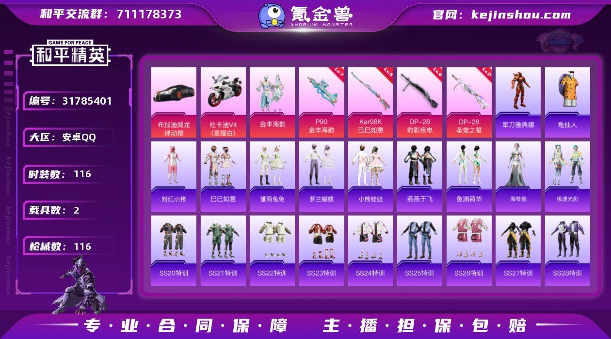 【1368】安卓 手Q-1粉装-4特效枪-2载具-1粉色飞行器-38695热力值-9王牌印记-116套装-116枪皮 【热门品类】:角色-军刀雅典娜,套装-龟仙人,套装-粉红小猪 【粉色载具】:布加迪威龙(律动橙),杜卡迪 Panigale V4(星耀白) 【粉色套装】:粉装-金丰海韵 【粉色枪皮等级】:P90-金丰海韵(七级),Kar98K-巳巳如意(五级),DP-28-圣堂之誓(二级),DP-28-豹影疾电(四级) 【粉色枪皮】:P90-金丰海韵,Kar98K-巳巳如意,DP-28-圣堂之誓,DP-28-豹影疾电 【粉色飞行器】:BEARBRICK飞行器 【粉色降落伞】:金丰海韵降落伞,月影灵韵降落伞,喜羊羊与灰太狼降落伞 【稀有套装】:套装-龟仙人,套装-巳巳如意,套装-雏菊兔兔,套装-萝兰蝴蝶,套装-小熊娃娃,套装-燕燕于飞,套装-鱼渊荷华,角色-海琴烟,套装-极速光影 【稀有枪皮】:AKM-彩虹符号,AKM-环太平洋,AKM-破晓战魂,AKM-龙的传人,M16A4-幻世战舞者,SCAR-L-炫彩节奏,SCAR-L-玉兔迎春,M416-糯团青竹,M416-红色方程式,GROZA-彩虹符号,AUG-耀粉歌者,QBZ-彩虹符号,M762-彩虹符号,AC-VAL-天降萌叽,AC-VAL-快闪甜心,蜜獾-垂柳戏鸭,蜜獾-天降萌叽,UZI-啾咪啾咪,UZI-天降萌叽,UZI-红色方程式,UZI-月影灵韵,UMP45-涂山之恋,UMP45-炫光之旅,Vector-焰鹰斗篷,Vector-彩虹符号,汤姆逊-天降萌叽,汤姆逊-环太平洋,汤姆逊-耀粉歌者,P90-快闪甜心,P90-巳巳如意,Kar98K-红色方程式,M24-炫彩节奏,AWM-焰鹰斗篷,SKS-糯团青竹,VSS-彩虹符号,SLR-彩虹符号,AMR-喜羊羊与灰太狼,MK20-H-快闪甜心,S686-彩虹符号,S686-红色方程式,S686-巳巳如意,S1897-炫彩节奏,S12K-玩趣呆呆,S12K-破晓战魂,S12K-幻世战舞者,DBS-焰鹰斗篷,DBS-彩虹符号,DBS-月影灵韵,M249-彩虹符号,M249-破晓战魂,DP-28-焰鹰斗篷,DP-28-彩虹符号,DP-28-玉鳞金羽,M...
