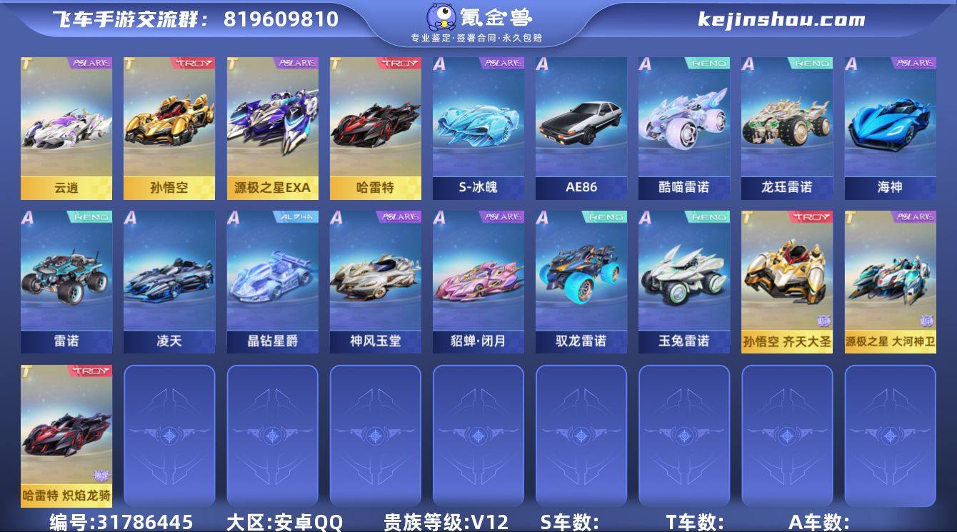 B652578 【釉龙/伏羲/6T/10魔法/4骑宠/高级个性化/多道具/七阶哈雷特炽焰龙骑/云逍/源极之星大河神卫/孙悟空齐天大圣/蓝波/鸭宝/弦音/霆光伏羲/冰魄釉龙/帝皇魂狮,火狱龙息,御天龙神,瑞泽祥麟/宠物:避水金晶兽,机甲金刚,源梦之星,魔王天狮,小悟空,小妲己,铠甲战士/双人座椅:红妆凤辇,灵境天卷,幽爵迷城】 A车数量122 游戏等级92 【否】 【可二次实名】 【永久包赔】 【安卓QQ】 稀有车型3 稀有永久A车5 T车皮肤3 永久T车5 宠物11 稀有车型:神风玉堂,孙悟空,哈雷特; 稀有永久A车:海神,驭龙雷诺,玉兔雷诺,酷喵雷诺,龙珏雷诺; T车皮肤:孙悟空齐天大圣,源极之星大河神卫,哈雷特炽焰龙骑; 永久T车:源极之星EXA,孙悟空,哈雷特,云逍,鸭宝超人; 宠物:避水金晶兽,机甲金刚,源梦之星,魔王天狮,瑞泽祥麟,小悟空,小妲己,帝皇魂狮,火狱龙息,铠甲战士,御天龙神;