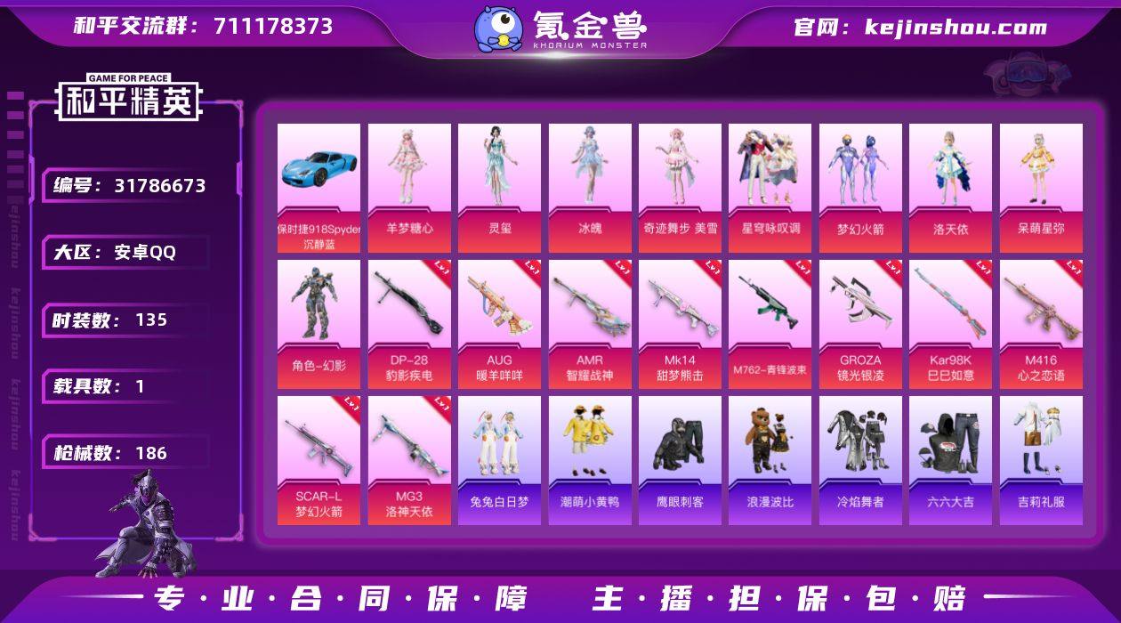 【女号梦幻洛天依 8粉装13特效枪1载具地铁禁赛介意勿拍可秒换绑】 安卓Q区-58112热力值-5印记-135套装-186枪皮 【1载具】 保时捷918 Spyder(沉静蓝)【8粉装】 梦幻火箭 洛天依 呆萌星弥 角色-灵玺 星穹咏叹调 角色-冰魄 角色-奇迹舞步 美雪 角色-羊梦糖心【10特效枪】 SCAR-L-梦幻火箭(2级) M416-心之恋语(4级) MG3-洛神天依(2级) AMR-智耀战神(7级) M762-青锋波束(5级) Mk14-甜梦熊击(4级) GROZA-镜光银凌(5级) Kar98K-巳巳如意(5级) DP-28-豹影疾电(5级) AUG-暖羊咩咩(5级)【22热门】 M416-蓝色火焰 长空猛禽 兔兔白日梦 浪漫天命 潮萌小黄鸭 鹰眼刺客 浪漫波比 暗影哥特(红眼罩) 极速红龙 白色伏地魔 SS27特训 SS25特训 SS23特训 SS22特训 Mk47-洛神天依 Mini14-梦幻火箭 SCAR-L-玉兔迎春 Mk47-乌木金纹 UMP45-蓝色火焰 M249-彩虹符号 MG3-幻世战舞者【4飞行器】 粉色滑翔尾迹 动力核心飞行器 炫彩糖果飞行器 极意拳锋飞行器 营地ID:979865890