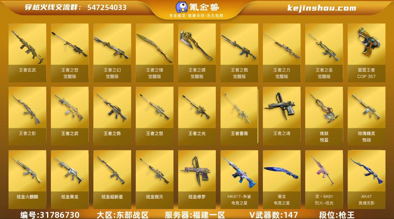 【自带包赔 最高三倍】:东部战区:福建一区-LV.102-荣耀元帅-枪王2-147V-21王者武器数-7炫金武器数 【热门武器】:C.A.T,COP 357-雷霆王者,G36C-幻影,HK417-朱雀,加特林-炼狱,金刚伞,Kar98K-星神,M4A1-青龙,M200-幻神,M4A1-黑骑士,QBZ03-金色蔷薇,RPK-盘龙*6,Scar Light-白虎,斯泰尔-蝴蝶,沙鹰-修罗*5,汤姆逊-烈龙*6,金色蔷薇-古蛇迷踪,修罗-古蛇迷踪,白虎-电玩蓝兔,MK5-炽火炎龙 【特殊枪械】:蝴蝶斯泰尔+6烈龙,1白虎,1黑骑士,6烈龙,6盘龙,1炼狱,1蝴蝶斯泰尔 【王者炫金武器】:王者之势,王者之武,王者之影*2,王者之光,王者之怒*2,王者蔷薇,王者之魂,炫金火麒麟,炫金骑士,炫金黑龙,炫金超新星,炫金毁灭,炫金修罗*2,玫瑰精灵-悦动,王者玄武,炼狱-悦蓝,COP 357-雷霆王者 【角色】:葵,零-水下丽影,魅影,青霞仙子,隼,蜀雪,铁骑荣耀,王者-瞳-闭月羞花,王者-零,王者复仇,王者玲珑-小乔,樱,影豹(四防)华(四防),战地猎狐,雪域霜狐,蛇隐宗,乔伊教练,修道士,云海玲珑,空,暗夜-X,北极狐-X,初恋灵狐,电竞少女,芳心审判者,飞虎队-X,风暴女,虎妞,嘉年华灵狐,兰-海滩派对,兰-新年限定,猎狐者-追月,0号玩家,灵狐者-X,灵狐者-黄金海岸,灵狐者-七夕宝贝,龙儿,龙儿-小淘气,麻雀,曼陀罗-X,曼陀罗-礼服,萌儿,潘多拉-X,潘多拉-甜心教官,潜龙队-X,蛇姬,斯沃特-X,兔囡囡,五号兵器-赛博朋克,新娜塔莎,雪莉杨,雪莉杨-摸金校尉,夜玫瑰-幻能朋克,夜玫瑰-宠粉,樱-战斗天使,影武者-X,游珑儿,职业选手,智影,海豹突击队