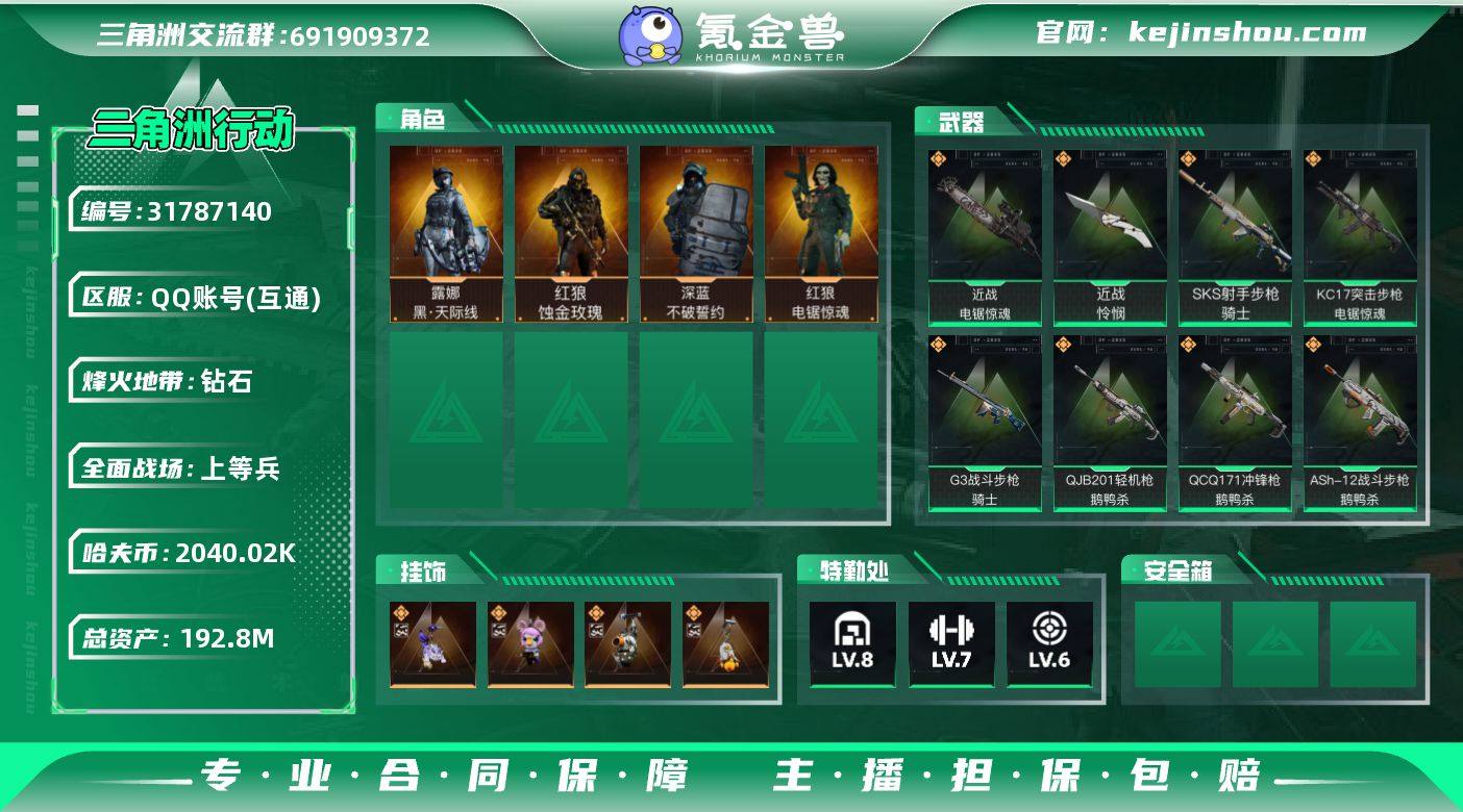 实名:不可二次实名 总资产:192.8M 哈夫币:2040.02K 烽火地带段位:钻石 烽火地带等级:60 全面战场段位:上等兵 全面战场等级:25 8级仓库,7级训练中心,6级靶场,6级指挥中心,1级潜水中心,3级防具台,3级工作台,3级制药台,3级技术中心,2级收藏室 战术部门等级:3 战斗部门等级:3 医疗部门等级:3 研发部门等级:2 后勤部门等级:2 曼德尔砖-气象感应:0 曼德尔砖-命运王牌:0 曼德尔砖-电玩高手:0 曼德尔砖-美杜莎:0