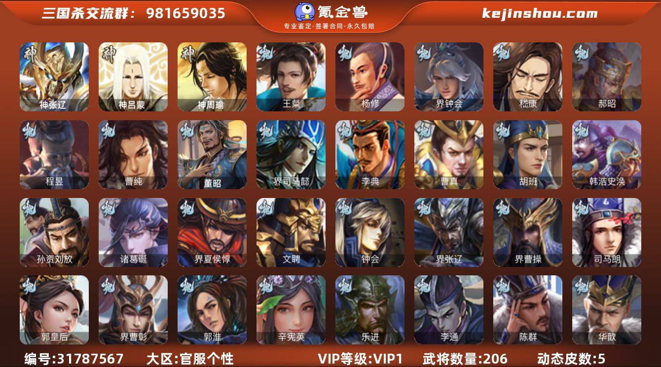 VIP等级:VIP1 官阶:领军将军 史诗武将数量:12 动态皮肤数量:5 宝珠数量:0 元宝数量:352 将魂数量:505 卖家说:界于吉12史诗3神动态排面领军,玉龙乌鸦动界钟会,动花鬘,郝昭,王粲,神张辽,董允,曹纯,嵇康,贺齐,杨修,左慈,程昱12史诗,神周瑜,神吕蒙,出框动态界关羽,动态关银屏,金皮界曹植,崔琰,谋高顺,界满宠,界曹彰,势陈到,甘夫人,张翼,界于吉,界马超,胡班,谋卢植,界刘表,刘巴206将,国战63将,3.3万豆,满级活树