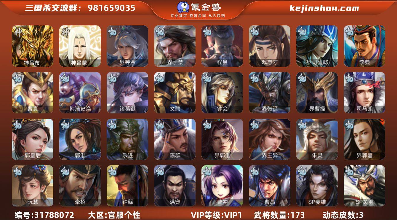 VIP等级:VIP1 官阶:中军将军 史诗武将数量:9 动态皮肤数量:3 宝珠数量:0 元宝数量:392 将魂数量:592 卖家说:9史诗中军,8.6万羽毛,7.3万豆,回廊动白马,戏志才,界钟会,神吕布,沙摩柯,花鬘,谯周,界于禁,程昱9史诗,神吕蒙,谋卢植,谋高顺,张布,界孙休,界朱治,界曹植,彭恙,张翼,阮慧,金皮界王异,界张嶷,界马超,贾充,界刘表173将,国战60将,满级活树