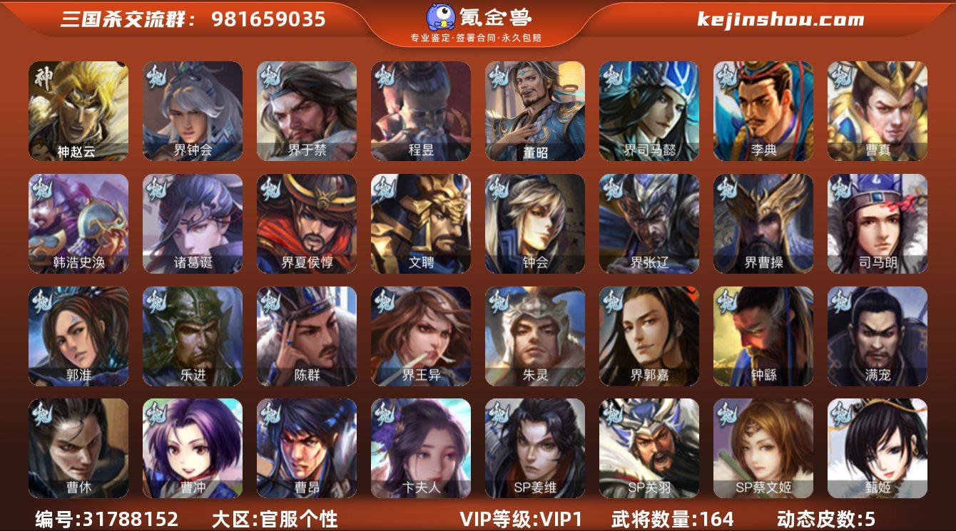 VIP等级:VIP1 官阶:中军将军 史诗武将数量:9 动态皮肤数量:5 宝珠数量:0 元宝数量:253 将魂数量:277 卖家说:9史诗中军,8万羽毛,7万豆,天工友徐庶,回廊动白马,神赵云,界钟会,沙摩柯,谋赵云,赵襄,谯周,界于禁,程昱9史诗,谋韩当,谋卢植,界吕布,关银屏,界马超,宗预,桥公,孙邵,界孙鲁班,界朱治,界刘表,荀谌164将,国战58将,满级活树