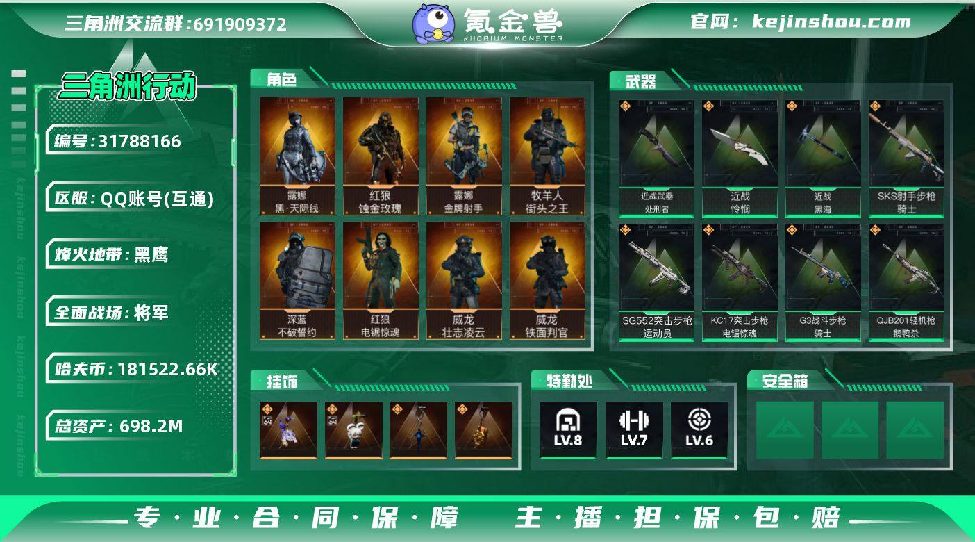 实名:不可二次实名 总资产:698.2M 哈夫币:181522.66K 烽火地带段位:黑鹰 烽火地带等级:60 全面战场段位:将军 全面战场等级:50 8级仓库,7级训练中心,6级靶场,6级指挥中心,1级潜水中心,3级防具台,3级工作台,3级制药台,3级技术中心,1级收藏室 战术部门等级:3 战斗部门等级:4 医疗部门等级:4 研发部门等级:3 后勤部门等级:4 曼德尔砖-气象感应:0 曼德尔砖-命运王牌:0 曼德尔砖-电玩高手:0 曼德尔砖-美杜莎:0