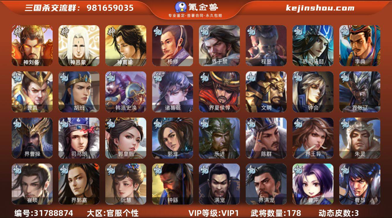 7史诗3神中军,7万豆,骆统,金皮张让,神刘备,界于禁,谯周,杨修,程昱7史诗,神周瑜,神吕蒙,动态诸葛果,动态曹冲,金皮界曹植,谋高顺,谋韩当,崔琰,界马超,界关羽,甘夫人,彭恙,界满宠,胡班,阮慧,金皮界王异,界朱治,友庞统,界刘表,刘琦,张梁176将,国战60将,满级活树