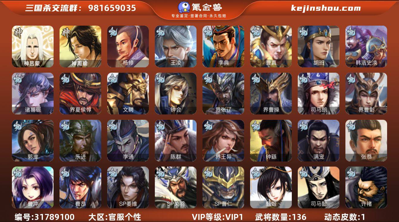 4史诗双神先锋,天工谋大乔,大宝界徐盛,出框动王凌,花鬘,杨修4史诗,神周瑜,神吕蒙,谋高顺,贾充,胡班,张恭,界曹彰,金皮界王异,界马超,蒋钦,濮阳兴135将,国战53将,4.3万豆,5.7万羽毛,满级活树
