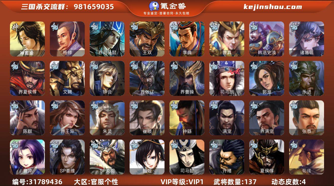 5史诗先锋,4.5万豆,大宝界徐盛,回廊动态星甘宁,界黄忠,谯周,杨修5史诗,神周瑜,动态界曹植,动态界刘备,金皮界吕布,界孙权,谋韩当,界满宠,谋高顺,崔琰,王双,张恭,带皮关银屏,金皮界王异,界关羽,界马超,界朱治,界孙鲁班,贾充,荀谌,友庞统137将,国战51将,2万羽毛,满级活树