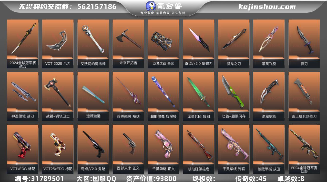 奇点2.0蝴蝶刀 2024全球冠军赛战刀 VCT2025爪刀 艾沃莉的梦之翼全套 千灵华绽全套 西部未来全套 掠影全套 耀鳞威龙全套 EDG队伍皮肤等 皮肤总价高,手感号,可玩性强。 ⚠️ 重要说明: 无二次实名,介意勿拍。 本人诚信卖家,纯自用号,绝不找回。 走平台担保交易,安全放心,非诚勿扰。