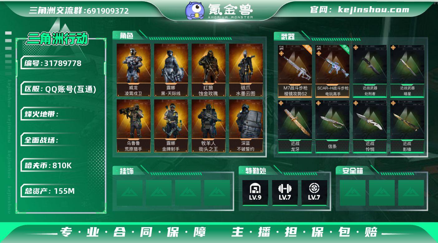 S1247 实名: 不可修改 总资产: 155000000 哈夫币: 810000 干员外观: 威龙-铁面判官(S1),红狼-蚀金玫瑰,牧羊人-街头之王(S2),威龙-壮志凌云(S3),骇爪-水墨云图,无名-夜鹰(S4),蜂医-送葬人·无题密令(S5),露娜-黑·天际线,深蓝-不破誓约(S6),红狼-电锯惊魂,露娜-金牌射手(S7),乌鲁鲁-荒原猎手,威龙-凌霄戍卫 传说武器皮肤: 近战-怜悯,近战-影锋,近战-北极星,近战-信条,近战-龙牙,近战-暗星,近战-处刑者