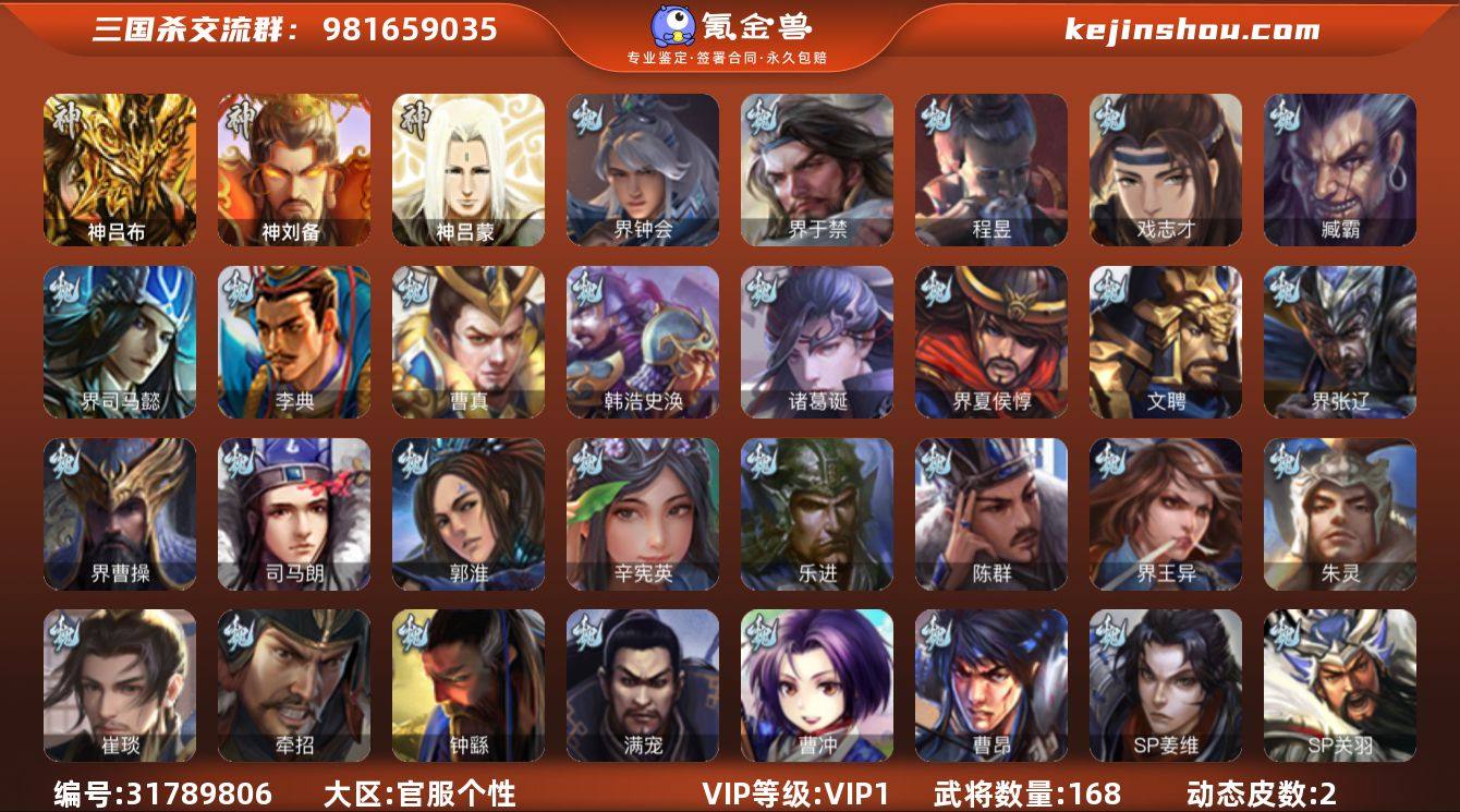VIP等级:VIP1 官阶:中军将军 史诗武将数量:7 动态皮肤数量:2 宝珠数量:0 元宝数量:317 将魂数量:298 卖家说:7史诗中军,8万羽毛,天工友徐庶,戏志才,界钟会,神吕布,神刘备,白马,界于禁,程昱7史诗,神吕蒙,动态诸葛果,金皮界曹植,崔琰,谋韩当,界孙休,界朱治,濮阳兴,张布,孙茹,界马超,金皮界王异,牵招,谋庞统,吴班,界刘表,友徐庶,界吕布,势田丰,王濬167将,国战56将,6.5万豆,满级活树