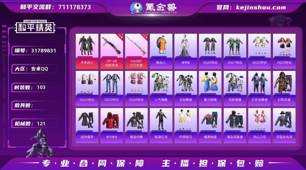 安卓 手Q-1粉装-2特效枪-0载具-1粉色飞行器-30247热力值-4王牌印记-103套装-121枪皮 【热门品类】:套装-龟仙人 【粉色套装】:粉装-未来战士 【粉色枪皮等级】:Kar98K-巳巳如意(三级),DP-28-豹影疾电(四级) 【粉色枪皮】:Kar98K-巳巳如意,DP-28-豹影疾电 【粉色飞行器】:炫彩糖果飞行器 【粉色降落伞】:千面幻镜降落伞,音爆索尼克降落伞,第五大道降落伞,圣堂之誓降落伞 【稀有套装】:套装-龟仙人,角色-海琴烟 【稀有枪皮】:AKM-彩虹符号,AKM-影袭,AKM-破晓战魂,AKM-龙的传人,M16A4-幻世战舞者,M16A4-生命誓言,M16A4-红色方程式,M16A4-蓝色火焰,SCAR-L-夜灯,SCAR-L-炫彩节奏,SCAR-L-玉兔迎春,SCAR-L-甜蜜誓约,SCAR-L-红色方程式,M416-彩虹嘻嘻猴,M416-糯团青竹,M416-红色方程式,M416-蓝色火焰,GROZA-彩虹符号,GROZA-懵萌河马,AUG-天降萌叽,AUG-耀粉歌者,QBZ-彩虹符号,QBZ-未来歌姬,M762-天降萌叽,Mk47-妙红点点,G36C-懵萌河马,AC-VAL-天降萌叽,蜜獾-垂柳戏鸭,蜜獾-娇憨猪猪,UZI-天降萌叽,UZI-娇憨猪猪,UZI-生命誓言,UZI-红色方程式,UMP45-夜灯,UMP45-涂山之恋,UMP45-生命誓言,UMP45-蓝色火焰,Vector-彩虹符号,Vector-生命誓言,汤姆逊-耀粉歌者,Kar98K-红色方程式,Kar98K-黑白懵懵牛,SKS-夜灯,SKS-未来歌姬,SKS-炫彩节奏,VSS-彩虹符号,Mini14-旋转彩虹,Mini14-涂山之恋,Mini14-炫彩节奏,Mini14-生命誓言,Mini14-耀粉歌者,Mk14-治愈之星,SLR-娇憨猪猪,SLR-彩虹符号,莫辛纳甘-懵萌河马,AMR-妙红点点,M417-惊鸿侠骨,M200-惊鸿侠骨,S686-生命誓言,S686-红色方程式,S1897-炫彩节奏,S12K-玩趣呆呆,S12K-娇憨猪猪,DBS-彩虹符号,DBS-第五大道,M249-妙红点点,M249-诡夜天鹅,DP-28-彩虹符号,DP-28-旋转彩虹,MG3-妙红点点,MG3-幻世战舞者...