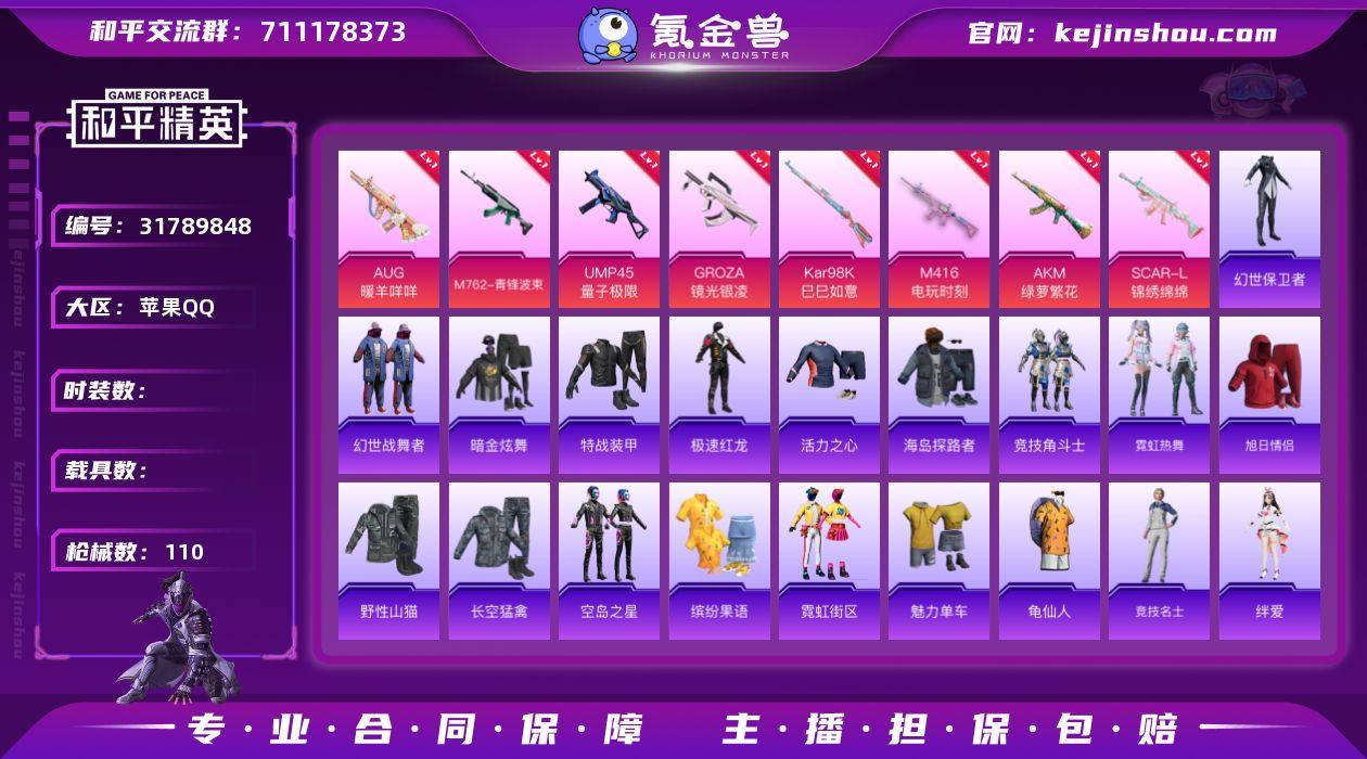6044-9特效枪-0载具-2粉色飞行器-31364热力值-5王牌印记-65套装-110枪皮 【热门品类】:套装-龟仙人 【粉色枪皮等级】:AKM-绿萝繁花(五级),SCAR-L-锦绣绵绵(五级),M416-电玩时刻(五级),GROZA-镜光银凌(五级),AUG-暖羊咩咩(五级),M762-青锋波束(五级),UMP45-量子极限(五级),Kar98K-巳巳如意(五级),DP-28-豹影疾电(五级) 【粉色枪皮】:AKM-绿萝繁花,SCAR-L-锦绣绵绵,M416-电玩时刻,GROZA-镜光银凌,AUG-暖羊咩咩,M762-青锋波束,UMP45-量子极限,Kar98K-巳巳如意,DP-28-豹影疾电 【粉色飞行器】:繁龙极客飞行器 【粉色降落伞】:萌物绒绒降落伞,圣堂之誓降落伞,祥瑞锦鲤降落伞,精灵梦叶罗丽降落伞,临安公主降落伞 【稀有套装】:套装-龟仙人,套装-巳巳如意,套装-雏菊兔兔,套装-萝兰蝴蝶,套装-燕燕于飞,套装-鱼渊荷华,角色-海琴烟,套装-霓虹热舞,角色-紫俏灵猫 【稀有枪皮】:M16A4-幻世战舞者,SCAR-L-夜灯,M416-糯团青竹,AUG-耀粉歌者,AC-VAL-快闪甜心,蜜獾-天降萌叽,UZI-啾咪啾咪,UMP45-夜灯,UMP45-生命誓言,Vector-焰鹰斗篷,P90-快闪甜心,P90-巳巳如意,Kar98K-六号树人,Kar98K-彩虹符号,Kar98K-星穹咏叹调,AWM-焰鹰斗篷,20-H-快闪甜心,20-H-樱桃泡泡,S686-生命誓言,S686-巳巳如意,S12K-玩趣呆呆,S12K-夜灯,S12K-极意拳锋,DBS-焰鹰斗篷,M249-彩虹符号,DP-28-焰鹰斗篷,DP-28-甜心宝贝,短管霰弹-星穹咏叹调,沙漠之鹰-快闪甜心,大砍刀-盛世惊鸿,破片手榴弹-巳巳如意 【其他套装】:套装-SS26特训,套装-SS27特训,套装-SS28特训,套装-SS29特训,套装-幻世保卫者,套装-幻世战舞者,套装-旭日情侣,套装-暗金炫舞,套装-极速红龙,套装-森林游猎者,套装-活力之心,套装-海岛探路者,套装-特战装