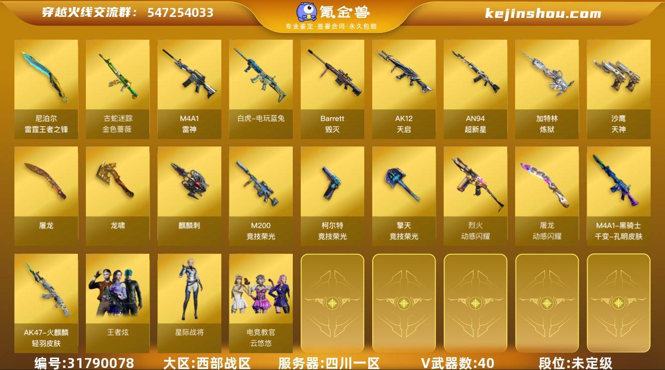 四川一区-46V-5王者武器数-0炫金武器数 【热门武器】:金色蔷薇-古蛇迷踪,修罗-古蛇迷踪,M200-竞技荣光,白虎-电玩蓝兔,Kar98K-星神,加特林-炼狱,羊驼玩偶*3 【王者炫金武器】:雷霆王者之锋 【音效卡】:Barrett-毁灭音效卡,Kar98K-星神音效卡,炼狱-百战金芒-庆典舞曲音效卡,AWM-昌龙-怀旧音效卡 【皮肤】:金色蔷薇-破浪逐光 皮肤,星神-黯钢战甲 皮肤,M4A1-再燃火线,火麒麟-轻羽皮肤,毁灭-星耀 皮肤,毁灭-英雄计划 皮肤,M4A1-千变-孔明皮肤,炼狱-星空,屠龙-破浪逐光 皮肤,轻型军用手斧-再燃火线 【角色】:电竞教官-云悠悠,星际战将,零·纪元,战地猎狐,王者炫,蛇隐宗,奇洋探员,乔伊教练,修道士,云海玲珑,葵-阿尔法武装,电竞少女,芳心审判者,风暴女,虎妞,嘉年华灵狐,0号玩家,龙儿,麻雀,潘多拉-X,蛇姬,斯沃特-X,新娜塔莎,游珑儿 【人偶武器】:迷你波特博士,迷你牛牛,生化手雷-机甲核心,灵狐娃娃手雷*2 【挑战大师】:冰龙粉碎者-白马银枪,激光毁灭者III-白马银枪,神圣爆裂者-末日III 【英雄级武器】:M4A1-雷神*2,AK12-天启,AN94-超新星,金色蔷薇-古蛇迷踪,烈火-动感闪耀,白虎-电玩蓝兔,Barrett-毁灭,Kar98K-星神,M200-竞技荣光,加特林-炼狱,炼狱-百战金芒,沙鹰-天神,柯尔特-竞技荣光,USP-冥王*2,天神-动感闪耀,修罗-古蛇迷踪,屠龙,龙啸*2,麒麟刺,擎天-竞技荣光,屠龙-动感闪耀,麒麟刺-百战金芒,高爆手雷-竞技荣光*2,手雷-动感闪耀,高爆手雷-古蛇迷踪,高爆手雷-雷霆王者-觉醒版,闪光弹-竞技荣光*2,闪光弹-雷霆王者-觉醒版*2,烟雾弹-竞技荣光,烟雾弹-古蛇迷踪,烟雾弹-雷霆王者-觉醒版,烟雾弹-荣耀世冠EP*2,M4A1-赤狱骑士,AWM-昌龙 【道具】:BS战队炫彩背包,CFS限定背包,全能枪王背包,古蛇迷踪炫彩背包,百战金芒炫彩背包,老虎...