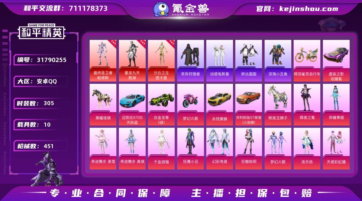 【3红装5级图卡盟小丑女螳螂48粉装34特效枪10载具猫包素材号 秒换绑不用等】 安卓Q区-180201热力值-20印记-305套装-451枪皮 【3红装】 沙丘之主-图卡盟(5级) 最终圣卫者-帕修斯(1级) 墨龙九天-敖渊(1级)【10载具】 路特斯EL蓝色 合金龙骨绿色 双人摩托梦幻火箭 永恒黄蜂 照夜玉狮子 宾利欧陆GT敞篷(火焰橘) 迈凯伦570S(天际蓝) 虚妄之影(炫耀紫) 黑曜夜骑 辉羽雀灵自行车【4稀有】 百万伏待背包(猫包) 奇异狩猎者 Mark.06蓝螳螂 8号机粉螳螂【48粉装】 角色-初号机 觉醒Ver. 狂魅哈莉(小丑女) 狂魇小丑(新小丑) 梦幻火箭 宝贝奶油派 天使彩虹糖 缤纷油彩(猪脸妹) 洛天依 绚金战神 甜蜜誓约 极致幻想 童趣迷兔 冰霜白皇 星之彼岸 恐龙拽拽 寒光使者 复仇流浪者 蝶舞迷情 酣梦娃娃 精灵娃娃 闪耀律动 幻梦音符 彩虹鹿灵 罪夜之冕 山涧鹿灵 镜光幻境 炙焰红王 霁雪冰心 霞光圣骑 相思残雪 烈焰拳霸 炙焰赤龙 飓风飞鹰 紫电风暴 铁血龙王 碧影闪光 暗夜鎏金 角色-异瞳寒姬 角色-小蓝 角色-美雪 角色-美琪 角色-严莉莉 角色-烟云彩露 角色-奇迹舞步 美琪 美雪 幻彩电音 角色-千金淑猫【34特效枪】 M416-墨龙九天(6级) Kar98K-圣域龙灵(2级) M24-镜域双华(1级) Vector-最终圣卫者(3级) MG3-辉羽雀灵(2级) P90-沙丘之主(3级) M416-五爪金龙(6级) M416-心之恋语(1级) AKM-炫紫旋律(5级) Mk14-福马献瑞(3级) M249-霁蓝缠春(1级) AA12-G-萌骑幻想(1级) GROZA-焦糖拿铁(5级) SCAR-L-梦幻火箭(1级) M24-星之信仰(5级) AWM-花间之火(5级) M762-甜心娃娃(5级) AUG-星之彼岸(7级) UMP45-相思残雪(5级) VSS-烈焰拳霸(2级) DP-28-幻梦音符(1级) MG3-洛神天依(5级) M249-绒雪飘舞(5级) Vector-环太平洋(5级) SCAR-L-机