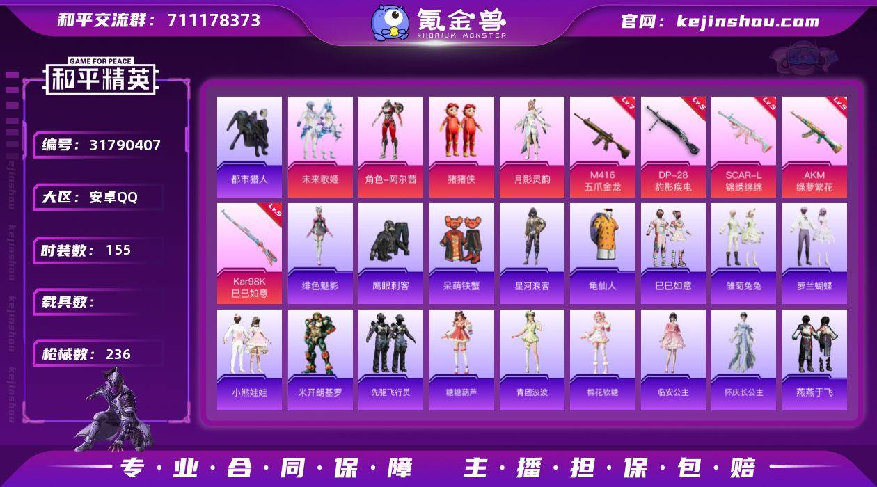安卓手Q H-GWM163【4粉装5特效枪2粉色飞行器 未来歌姬/阿尔茜/猪猪侠/月影灵韵/都市猎人/星河浪客/龟仙人/米开朗基罗/临安公主/怀庆长公主/蜜桃派对/绯色魅影/蝶吟花词/呆萌铁蟹/冰川特警】69552热力值17王牌印记155套装236枪皮 【热门品类】:套装-都市猎人,套装-星河浪客,套装-龟仙人 【粉色套装】:粉装-未来歌姬,角色-阿尔茜,玩偶服-猪猪侠,角色-月影灵韵 【粉色枪皮等级】:AKM-绿萝繁花(五级),SCAR-L-锦绣绵绵(五级),M416-五爪金龙(七级),Kar98K-巳