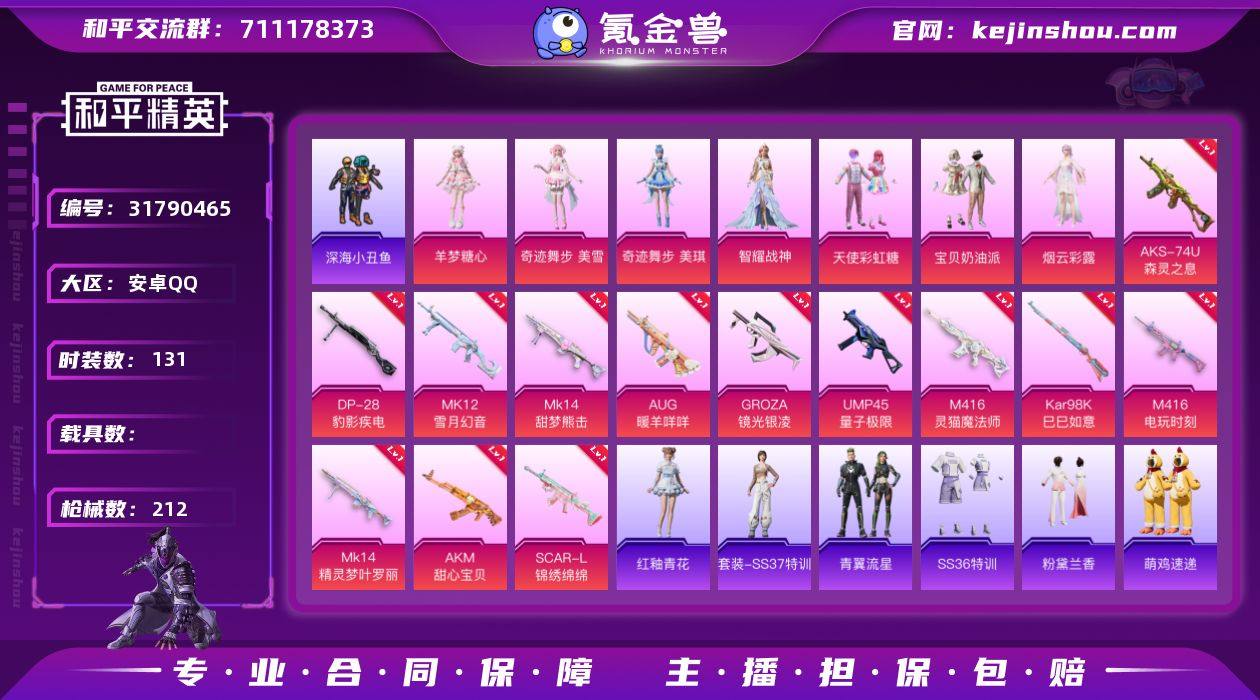 【82】安卓 手Q-7粉装-11特效枪-2载具-1粉色飞行器-75713热力值-10王牌印记-164套装-234枪皮 【热门品类】:套装-都市猎人,套装-深海小丑鱼,角色-军刀雅典娜,套装-龟仙人,套装-暗影哥特,角色-Mark.06 【粉色套装】:粉装-铁血龙王,粉装-暗夜玫瑰,粉装-飒粉甜心,角色-阿尔茜,角色-智耀战神,角色-奇迹舞步 美琪,角色-奇迹舞步 美雪 【粉色枪皮等级】:AKM-绿萝繁花(五级),M16A4-垂柳戏鸭(四级),SCAR-L-机甲封神(五级),M416-五爪金龙(七级),GROZA-镜光银凌(五级),AUG-暖羊咩咩(五级),ARX-无垠阁(五级),Kar98K-巳巳如意(五级),Mk14-甜梦熊击(五级),M249-蓝莓炮弹(四级),DP-28-豹影疾电(五级) 【粉色载具】:兰博基尼Estoque(银翼灰),幻影随行 【粉色枪皮】:AKM-绿萝繁花,M16A4-垂柳戏鸭,SCAR-L-机甲封神,M416-五爪金龙,GROZA-镜光银凌,AUG-暖羊咩咩,ARX-无垠阁,Kar98K-巳巳如意,Mk14-甜梦熊击,M249-蓝莓炮弹,DP-28-豹影疾电 【粉色降落伞】:烈焰拳霸降落伞,暗夜玫瑰降落伞,洛神天依降落伞,庄周梦蝶降落伞,垂柳戏鸭降落伞,旋转彩虹降落伞,青空秋雨降落伞,第五大道降落伞,未来歌姬降落伞,炫光之旅降落伞,精灵梦叶罗丽降落伞,星穹咏叹调降落伞,荧海星豚降落伞,绯穹魔姬降落伞,炫彩糖果降落伞 【稀有套装】:套装-龟仙人,套装-绒宝小鹅,套装-巳巳如意,套装-雪国风尚,套装-炫彩糖果,套装-糖糖葫芦,套装-青团波波,角色-摩登魅猫,套装-燕燕于飞,套装-鱼渊荷华,套装-蓝海鲸歌,套装-朱霞炽焰,套装-凌霄紫焰 【稀有枪皮】:AKM-夜灯,AKM-影袭,AKM-缤纷海域,AKM-萌趣颜团子,AKM-虎虎生威,AKM-龙的传人,M16A4-幻世战舞者,M16A4-甜心亚梦,SCAR-L-玉兔迎春,SCAR-L-红色方程式,SCAR-L-金风玉露,M416-糯团青竹,M416-红色方程式,M416-蓝色火焰,GROZA-2B战...