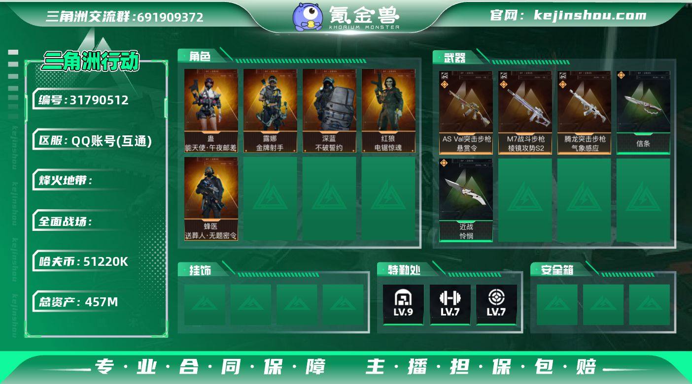 S1164 总资产457M,哈夫币5122w,典藏3 近战3 枪皮数量240,蛊-能天使午夜邮差/露娜-金牌射手/红狼-电锯惊魂/深蓝-不破誓约/蜂医-送葬人无题密令,近战-信条/近战-怜悯,AS Val突击步枪-悬赏令(优品S)/M7战斗步枪-棱镜攻势S2(优品B)/腾龙突击步枪-气象感应(优品B)战场等级50上等兵, 行动等级60钻石,安全箱等时效性道具请以游戏内数据为准,详情请看图