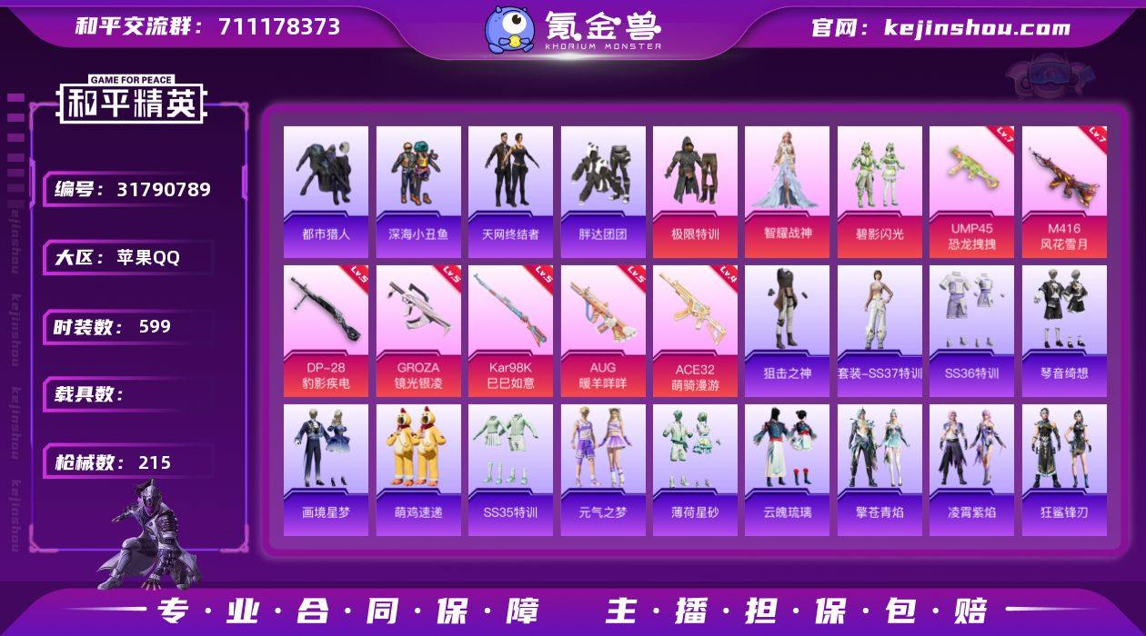 实名:不可二次实名 是否支持人脸包赔:不支持 粉装数量:3 特效枪数量:7 时装数:599 枪械数:215 都市猎人,胖达团团,深海小丑鱼,天网终结者 碧影闪光,极限特训,智耀战神 七级M416-风花雪月,七级UMP45-恐龙拽拽,五级DP-28-豹影疾电,五级AUG-暖羊咩咩,五级GROZA-镜光银凌,五级Kar98K-巳巳如意,四级ACE32-萌骑漫游 狙击之神,SS37特训,画境星梦,琴音绮想,SS36特训,萌鸡速递,SS35特训,元气之梦,薄荷星砂,云魄琉璃,狂鲨锋刃,凌霄紫焰,擎苍青焰,SS34特训套装,朱霞炽焰,暗影哥特,暗夜魅影,冰冻风暴,缤纷果语,北国孤狼,滨海假日,白色伏地魔,冰爽海盐,纯白跃动,长空猛禽,丛林猎人,潮流游乐家,传奇侦探,顶瓜瓜,大橘大利,呆萌铁蟹,都市猎人,都市漫游者,飞驰魅影,绯格组合,粉红小猪,粉恋花,福星高照,飞行日记,格斗先锋,贵族骑装,华灯初上,海岛探路者,鹤鸣,虎虎生威吉莉,湖蓝色名流,憨乐熊二,黑色伏地魔,灰色格斗者,黄色名流,海上生明月,黄色运动,幻世战舞者,惊鸿侠骨,娇憨猪猪,击剑大师,竞技名士,竞技勇士朋克,吉莉礼服,极速红龙,极速竞梦,锦衣飞扬,金耀舞者,绛羽幽主,快乐星愿,蓝冰羽,龙的传人,冷酷挑战者,六六大吉,猎梦纪元,蓝色守护者,恋语绒绒,漫步者,萌黄之夏,魅力单车,萌趣咩咩,萌趣颜团子,霓虹极客,霓虹街区,霓虹热舞,牛气冲天,牛气满满,胖达团团,破蛋小黄鸡,青春冒险家,青春校园,绮丽涂鸦,青年教官,青涩时光,骑行爱好者,青玉碎影,云朵鹅,瑞龙福将,荣耀,日照花林,深海小丑鱼,森林游猎者,沙漠雄狮,SS10特训,SS12特训,SS13特训,SS14特训,SS15特训,SS16特训,SS17特训,SS18特训,SS19特训,SS20特训,SS21特训,SS22特训,SS24特训,SS25特训,SS27特训,SS31特训套装,SS32特训套装,SS33特训套装,SS6特训,SS7特训,SS8特训,SS9特训,巳巳如意,石蕴玉辉,探宝勇士,特殊使命,涂山之恋,天网终结者,甜心亚梦,团圆交子,特种颜团子,特战装甲,完美偶像,炫蓝之夏,星梦畅游,雪绒豹,旭日情侣,夏日倾情,夏日音浪,虚音幻奏,异彩先驱,跃动心情,音速流光,焰山流火,玉兔迎春,鹰眼刺客,鱼渊荷华,燕燕于飞,异域银装,智谋强哥,朱雀圣者,紫幽梦,灼焰舞者 星之彼岸飞行器,无垠阁降落伞,碧影闪光降落伞,春暖花开降落伞,绯穹魔姬降落伞,江南烟雨降落伞,激战未来降落伞,冷漠罗丽降落伞,绿意幻情降落伞,凝视深渊降落伞,炫光之旅降落伞,闲梦青缨降落伞