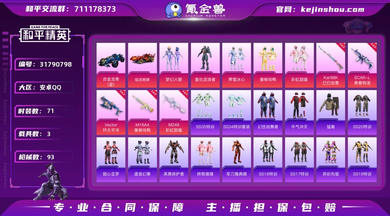 【梦幻火箭3载具5粉装5特效枪 秒换绑不用等】 安卓Q区-36782热力值-1印记-71套装-93枪皮 【3载具】 路特斯EL蓝色 合金龙骨蓝色 焰龙咆哮【5粉装】 梦幻火箭 彩虹甜喵 复仇流浪者 垂柳戏鸭 霁雪冰心【5特效枪】 SCAR-L-青春物语(5级) M16A4-垂柳戏鸭(4级) M249-彩虹甜喵(4级) Vector-环太平洋(6级) Kar98K-巳巳如意(5级)【53热门】 军刀雅典娜 英勇保护者 团圆交子 瑞龙福将 SS24特训 Mini14-梦幻火箭 AKM-环太平洋 SCAR-L-玉兔迎春 Mk47-乌木金纹 UZI-娇憨猪猪 UMP45-蓝色火焰 S12K-垂柳戏鸭 MG3-幻世战舞者 AKM-虎虎生威 AKM-霓虹街区 M416-圣诞惊喜 M416-蓝色火焰 GROZA-异彩先驱 长空猛禽 异彩先驱 虚音幻奏 甜心亚梦 牛气冲天 霓虹极客 懵萌河马 魅力单车 猎鹰 黄色伏地魔 黑色伏地魔 M762-瑞龙福将 恋语绒绒 SS34特训 SS18特训 SS16特训 SS17特训 SS19特训 SS20特训 SS21特训 SS31特训 SS32特训 MG3-霓彩脉冲 AKM-彩虹符号 撬棍-环太平洋 平底锅-光之冒险 平底锅-瑞龙福将 MG3-乌木金纹 平底锅-异彩先驱 平底锅-甜心亚梦 平底锅-娇憨猪猪 SS35特训 破片手榴弹-拽到爆炸 十字弩-异瞳寒姬 平底锅-懵萌河马【2飞行器】 青春物语飞行器 UMP45-涂山之恋【12背包】 瑞龙福将背包(3级) 异彩先驱背包(3级) 彩虹甜喵背包(3级) 绒雪飘舞背包(3级) 巳巳如意背包(3级) 海盐物语背包(3级) 甜心亚梦背包(3级) 异瞳寒姬背包(3级) 垂柳戏鸭背包(3级) 环太平洋背包(3级) 梦幻火箭背包(3级) 虎虎生威背包(3级) 营地ID:786389745