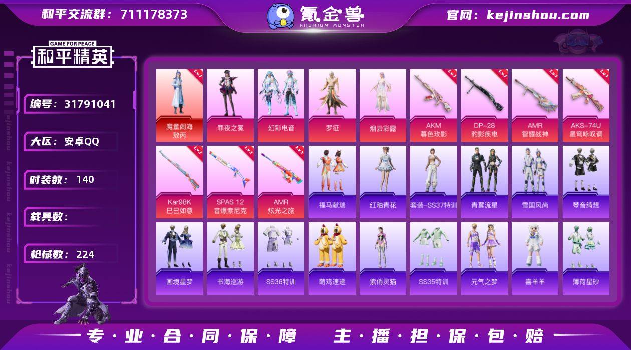 【82】安卓 手Q-7粉装-11特效枪-2载具-1粉色飞行器-75713热力值-10王牌印记-164套装-234枪皮 【热门品类】:套装-都市猎人,套装-深海小丑鱼,角色-军刀雅典娜,套装-龟仙人,套装-暗影哥特,角色-Mark.06 【粉色套装】:粉装-铁血龙王,粉装-暗夜玫瑰,粉装-飒粉甜心,角色-阿尔茜,角色-智耀战神,角色-奇迹舞步 美琪,角色-奇迹舞步 美雪 【粉色枪皮等级】:AKM-绿萝繁花(五级),M16A4-垂柳戏鸭(四级),SCAR-L-机甲封神(五级),M416-五爪金龙(七级),GROZA-镜光银凌(五级),AUG-暖羊咩咩(五级),ARX-无垠阁(五级),Kar98K-巳巳如意(五级),Mk14-甜梦熊击(五级),M249-蓝莓炮弹(四级),DP-28-豹影疾电(五级) 【粉色载具】:兰博基尼Estoque(银翼灰),幻影随行 【粉色枪皮】:AKM-绿萝繁花,M16A4-垂柳戏鸭,SCAR-L-机甲封神,M416-五爪金龙,GROZA-镜光银凌,AUG-暖羊咩咩,ARX-无垠阁,Kar98K-巳巳如意,Mk14-甜梦熊击,M249-蓝莓炮弹,DP-28-豹影疾电 【粉色降落伞】:烈焰拳霸降落伞,暗夜玫瑰降落伞,洛神天依降落伞,庄周梦蝶降落伞,垂柳戏鸭降落伞,旋转彩虹降落伞,青空秋雨降落伞,第五大道降落伞,未来歌姬降落伞,炫光之旅降落伞,精灵梦叶罗丽降落伞,星穹咏叹调降落伞,荧海星豚降落伞,绯穹魔姬降落伞,炫彩糖果降落伞 【稀有套装】:套装-龟仙人,套装-绒宝小鹅,套装-巳巳如意,套装-雪国风尚,套装-炫彩糖果,套装-糖糖葫芦,套装-青团波波,角色-摩登魅猫,套装-燕燕于飞,套装-鱼渊荷华,套装-蓝海鲸歌,套装-朱霞炽焰,套装-凌霄紫焰 【稀有枪皮】:AKM-夜灯,AKM-影袭,AKM-缤纷海域,AKM-萌趣颜团子,AKM-虎虎生威,AKM-龙的传人,M16A4-幻世战舞者,M16A4-甜心亚梦,SCAR-L-玉兔迎春,SCAR-L-红色方程式,SCAR-L-金风玉露,M416-糯团青竹,M416-红色方程式,M416-蓝色火焰,GROZA-2B战...