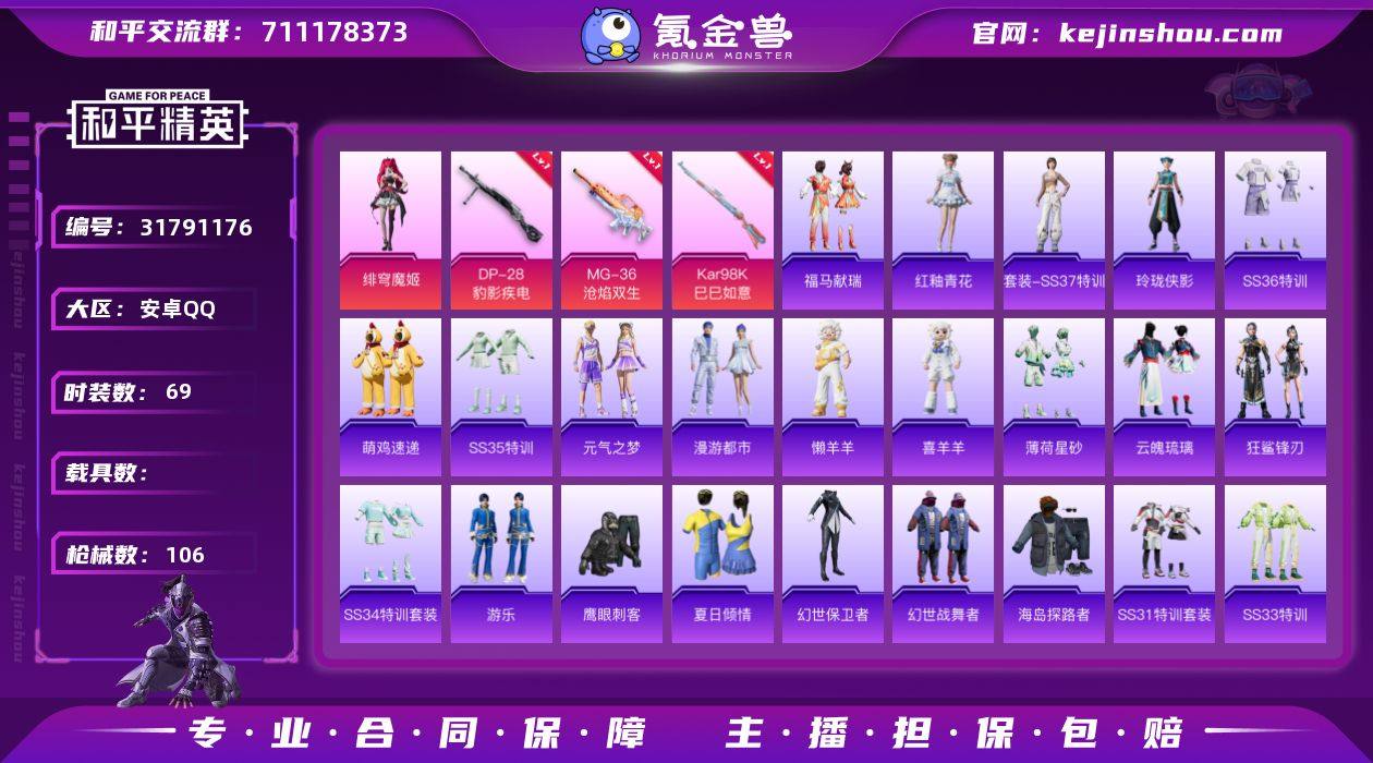 可二次实名【5特效枪1粉装 秒换绑不用等】 安卓Q区-26366热力值-3印记-69套装-106枪皮 【1粉装】 角色-绯穹魔姬【5特效枪】 Mk14-福马献瑞(5级) UMP45-萌骑冒险(5级) Kar98K-巳巳如意(5级) DP-28-豹影疾电(5级) MG-36-沧焰双生(5级)【114热门】 鹰眼刺客 M762-天降萌叽 MG3-幻世战舞者 夏日倾情 魅力单车 漫步者 黑色伏地魔 海岛探路者 S1897-糯团青竹 AA12-G-雨过天青 沙漠之鹰-雨过天青 海琴烟 GROZA-紫矿核心 玲珑侠影 M16A4-雨过天青 冰河战士 MG-36-薄荷星砂 GROZA-福马献瑞 恋语绒绒 SS34特训 漫游都市 AWM-天降萌叽 福马献瑞 大橘大利 蓝冰羽 龙魂突击队 ACE32-冰晶雪宝 鱼渊荷华 大砍刀-鬼刀 M24-天降萌叽 PKM-啾咪啾咪 M16A4-冰河战士 燕燕于飞 暗械蛇影 SS31特训 SS33特训 SS32特训 巳巳如意 紫幽梦 游乐 狂鲨锋刃 SS36特训 智谋强哥 战术大师 马上来财 蜜獾-启元战纹 Kar98K-星穹咏叹调 烟雾弹-炽纹蛇影 撬棍-炽纹蛇影 狙击之神 UMP45-海盐豹豹 Mk14-紫晶流影 MK20-H-星途旅人 幻世保卫者 Mk14-薄荷星砂 AUG-紫晶流影 AMR-鸡智如我 AMR-喜羊羊与灰太狼 燃烧瓶-福马献瑞 PKM-紫幽梦 Mk14-冰河战士 Kar98K-顶峰精英 Mini14-香桃花海 破片手榴弹-巳巳如意 Mk14-紫幽梦 SCAR-L-星途旅人 AKM-涂鸦街区 UZI-冰河战士 平底锅-属我最6 SS35特训 S1897-紫幽梦 P92-紫幽梦 野牛-燕燕于飞 星途旅人 玩偶服-喜羊羊 薄荷星砂 平底锅-紫幽梦 蝶变 破片手榴弹-星途旅人 香桃花海 SPAS-12-燕燕于飞 Vector-燕燕于飞 元气之梦 蝎式手枪-燕燕于飞 十字弩-燕燕于飞 S12K-霓彩脉冲 VSS-香桃花海 AKM-霓彩脉冲 AUG-异域银装 十字弩-异域银装 破片手榴弹-炽纹蛇影 R45-幻彩电音 破片