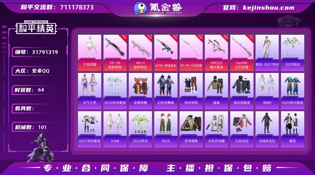 【6特效枪1粉装 秒换绑不用等】 安卓Q区-28389热力值-4印记-64套装-101枪皮 【1粉装】 角色-千金淑猫【6特效枪】 M762-青锋波束(5级) DP-28-千金淑猫(5级) Kar98K-巳巳如意(5级) Mk14-甜梦熊击(5级) GROZA-镜光银凌(5级) DP-28-豹影疾电(5级)【121热门】 深海小丑鱼 白色伏地魔 M762-天降萌叽 UMP45-蓝色火焰 MG3-幻世战舞者 AKM-虎虎生威 呆萌铁蟹 M416-蓝色火焰 长空猛禽 弄潮海豚 特训学院 魅力单车 猎鹰 黄色运动 红色运动 黑色伏地魔 海岛探路者 纯真浪花 GROZA-紫矿核心 爆炸猎弓-虚空骇客 AC-VAL-玩趣呆呆 顶瓜瓜 冰河战士 雏菊兔兔 SS34特训 创世·追猎 大橘大利 蓝冰羽 AKS-74U-尼罗河传说 临安公主 龙魂突击队 SS29特训 萝兰蝴蝶 SS30特训 青团波波 鱼渊荷华 糖糖葫芦 SS28特训 PKM-啾咪啾咪 M16A4-冰河战士 燕燕于飞 SS31特训 SS33特训 SS32特训 巳巳如意 紫幽梦 棉花软糖 M762-雏菊兔兔 雪绒豹 MG3-霓彩脉冲 Mini14-雏菊兔兔 R1895-雏菊兔兔 曼妙人鱼 热情海星 智谋强哥 战术大师 云朵鹅 狙击之神 UMP45-海盐豹豹 大砍刀-黑金刀 平底锅-许七安 M249-金丰海韵 MK20-H-星途旅人 短管霰弹-竹节火铳 PKM-紫幽梦 Mk14-冰河战士 GROZA-海盐豹豹 Mini14-香桃花海 破片手榴弹-巳巳如意 Mk14-紫幽梦 M16A4-千金淑猫 SCAR-L-星途旅人 AKM-涂鸦街区 S686-千金淑猫 蝎式手枪-千金淑猫 野牛-雏菊兔兔 平底锅-雏菊兔兔 UZI-冰河战士 平底锅-属我最6 SS35特训 S1897-紫幽梦 蜜獾-糖糖葫芦 平底锅-糖糖葫芦 P92-紫幽梦 野牛-燕燕于飞 UMP45-糖糖葫芦 星途旅人 小熊娃娃 薄荷星砂 MK20-H-糖糖葫芦 平底锅-紫幽梦 蝶变 破片手榴弹-星途旅人 SPAS-12-燕燕于飞 P18C-糖糖葫芦 摩