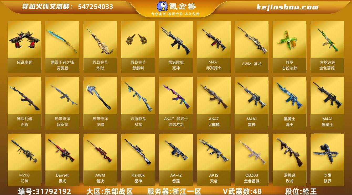 浙江一区-53V-1王者-0炫金 【传说武器】:传说幽冥 【传说角色】:传说影煞 【热门武器】:传说幽冥,QBZ03-金色蔷薇,M200-幻神,金色蔷薇-古蛇迷踪,修罗-古蛇迷踪,死亡之眼,荣耀世冠-雷神,Kar98K-星神,M4A1-黑骑士,汤姆逊-烈龙*2,羊驼玩偶*2,沙鹰-修罗*5,炽芒蝶刃,炽芒蝶刃-荣耀世冠白鲨2023 皮肤 【音效卡】:M4A1-雷神音效卡,M4A1-黑骑士音效卡,Kar98K-星神音效卡,炼狱-百战金芒-庆典舞曲音效卡,死神-雪域霜狐-怀旧音效卡 【皮肤】:幻神-星耀 皮肤,裁决-运输船 皮肤,雷神-宇航兔皮肤,雷神-15周年嘉年华 皮肤,M4A1-雷神-巅峰荣耀皮肤,雷神-源计划2.0专属 皮肤,雷神-化蛇 皮肤,M4A1-再燃火线,火麒麟-平天大圣,毁灭-星空,毁灭-战神张飞,黑骑士-破浪10年皮肤,黑骑士-破界 皮肤,天启-暗月,AK47-B-常胜将军-孙权,屠龙-星火燎原,屠龙-春桃 皮肤,屠龙-惊鸿 皮肤,轻型军用手斧-再燃火线,炽芒蝶刃-荣耀世冠白鲨2023 皮肤 【角色】:枪娘樱,谜,审判者,战地猎狐,雪域霜狐,蛇隐宗,奇洋探员,云海玲珑,嘉年华灵狐,灵动武士,灵狐者-X,灵狐者-职业经理,潘多拉-X,蛇姬,兔囡囡,游珑儿 【人偶武器】:星神-炽天使,Barrett-云海玲珑,AWM-灵狐-15周年嘉年华,M37-葵,迷你生化手雷,生化手雷-机甲核心,闪光弹-小乔,迷你艾比 【暴走生化】:死亡之眼 【挑战大师】:激光毁灭者III-白马银枪,神圣爆裂者-末日III 【英雄级武器】:AK47-火麒麟,M4A1-雷神*2,M4A1-黑骑士,AK12-天启,无影-神兵利器,黑武士-锦绣游龙,超新星-热带奇洋,金色蔷薇-古蛇迷踪,死神-雪域霜狐,QBZ03-金色蔷薇,黑骑士-海王,AK47-B-常胜将军,荣耀世冠-雷神,Barrett-极光,AWM-裁决,M200-幻神,Kar98K-星神,炼狱-百战金芒,汤姆逊-烈龙*2,烈龙-云海游龙,AA-12-雷霆,沙鹰-修罗*5,天神-动感闪...